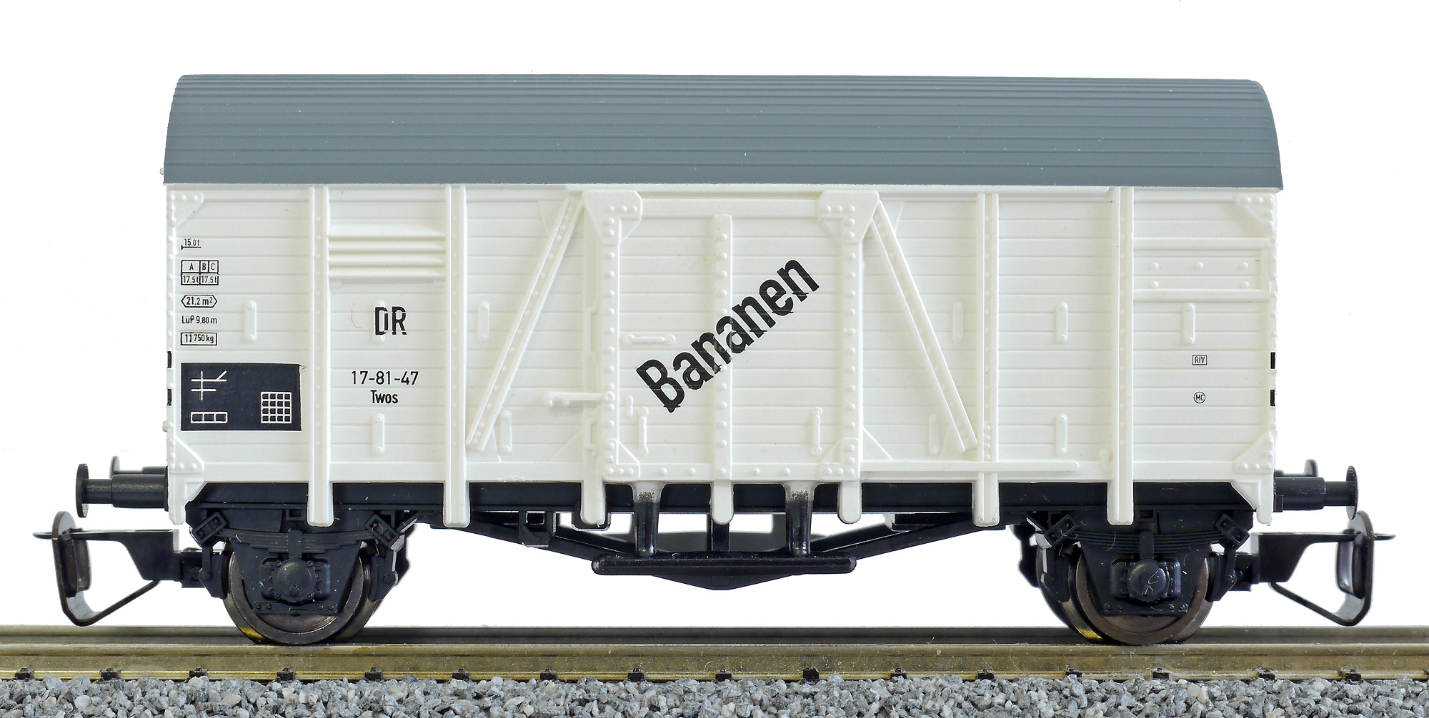 | nákladní vůz bílý s tmavě s šedou střechou „Bananen“ |