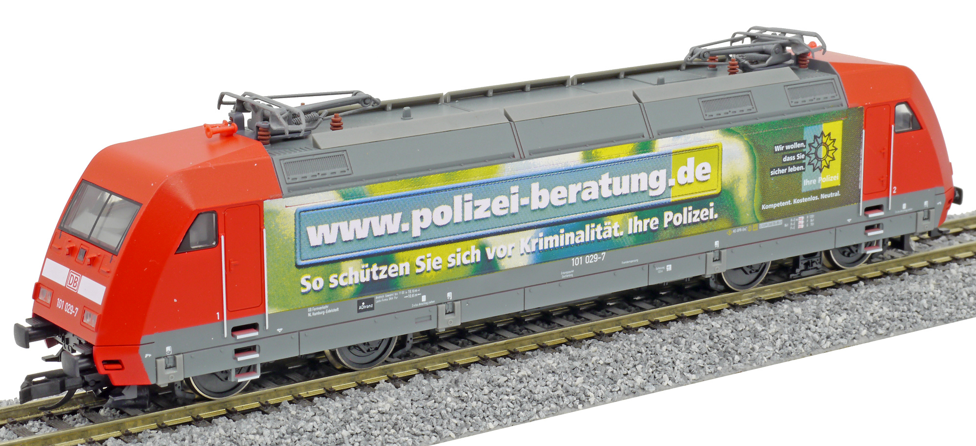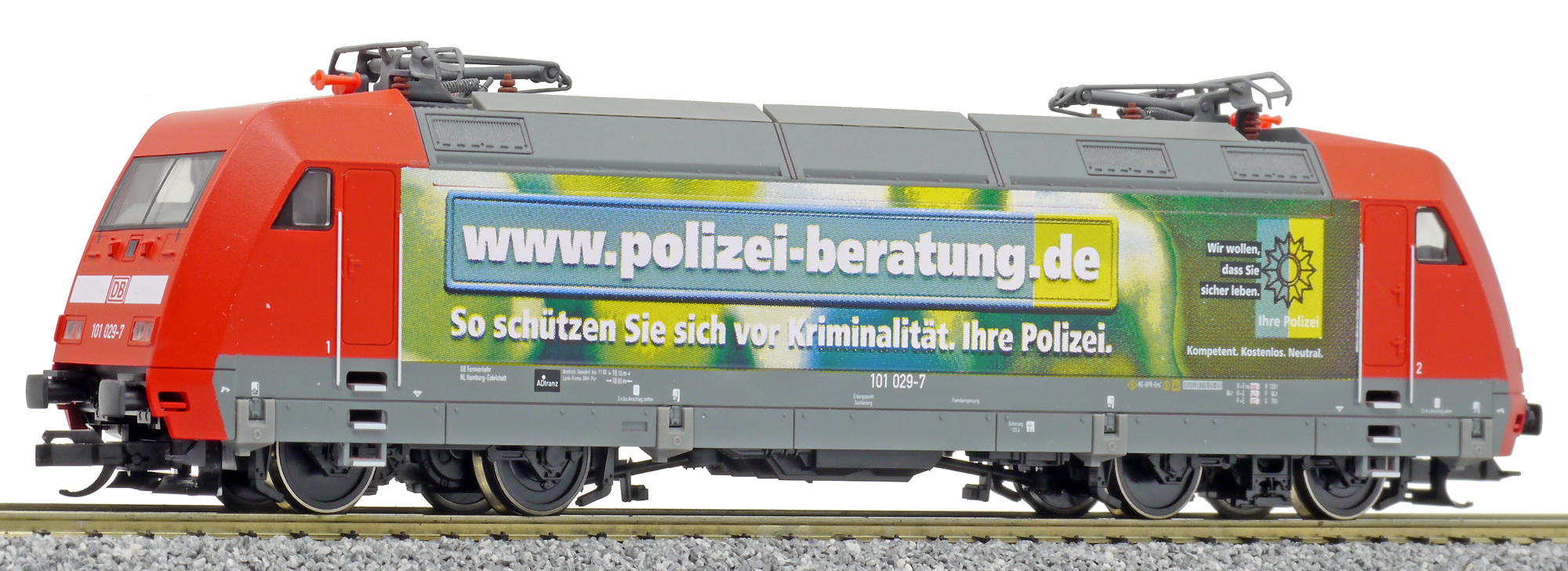 Popis   elektrická lokomotiva červená s reklamním potiskem „Polizei“