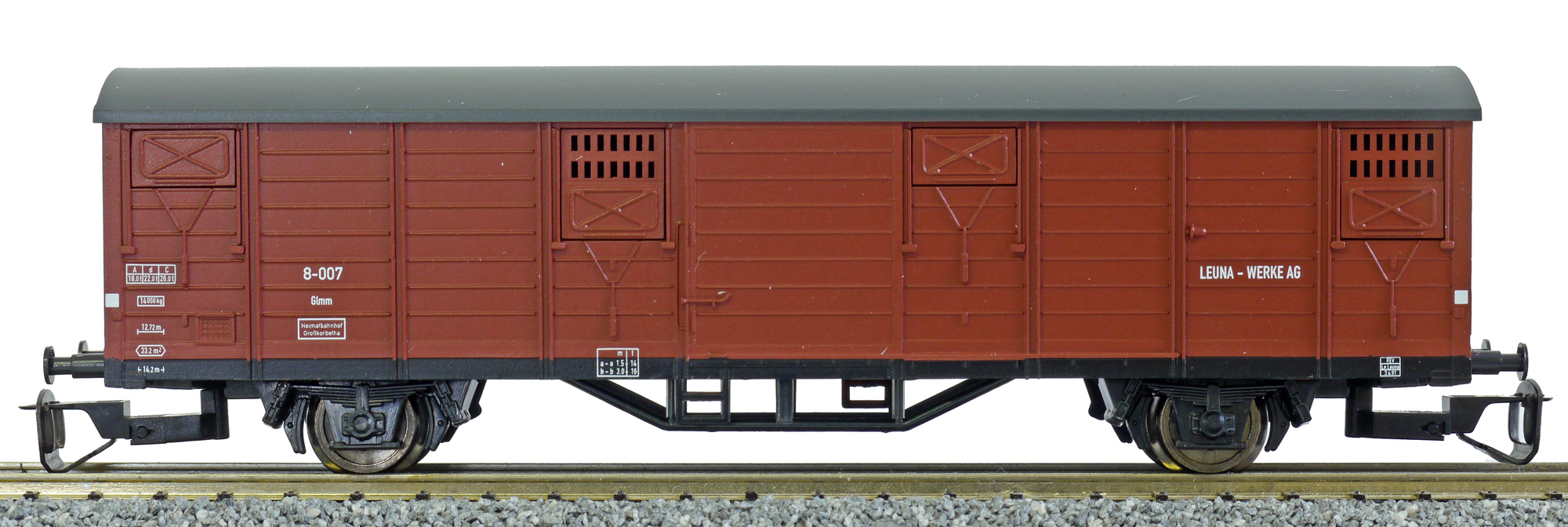 | krytý nákladní vůz červenohnědý s tmavě šedou střechou „Leuna“ |