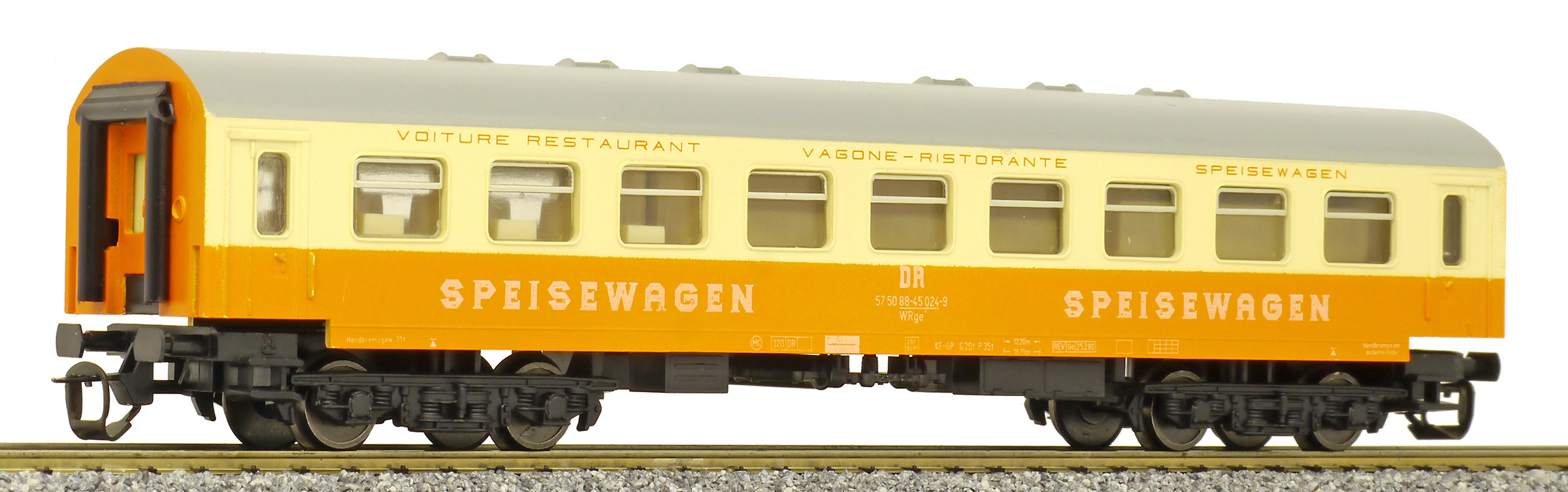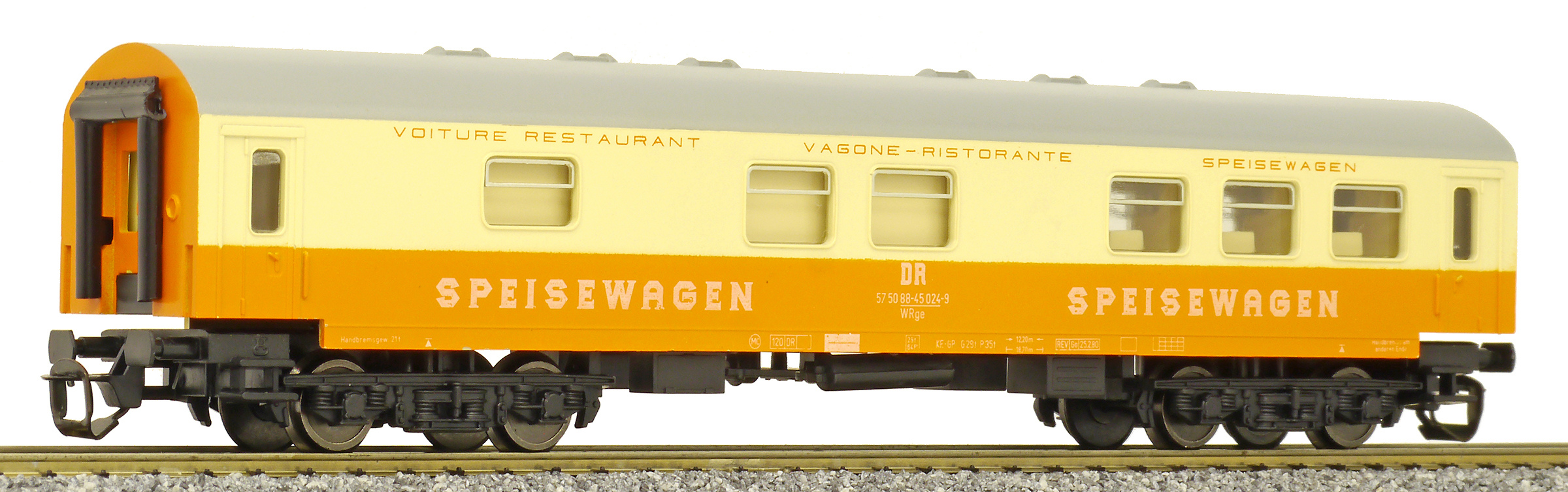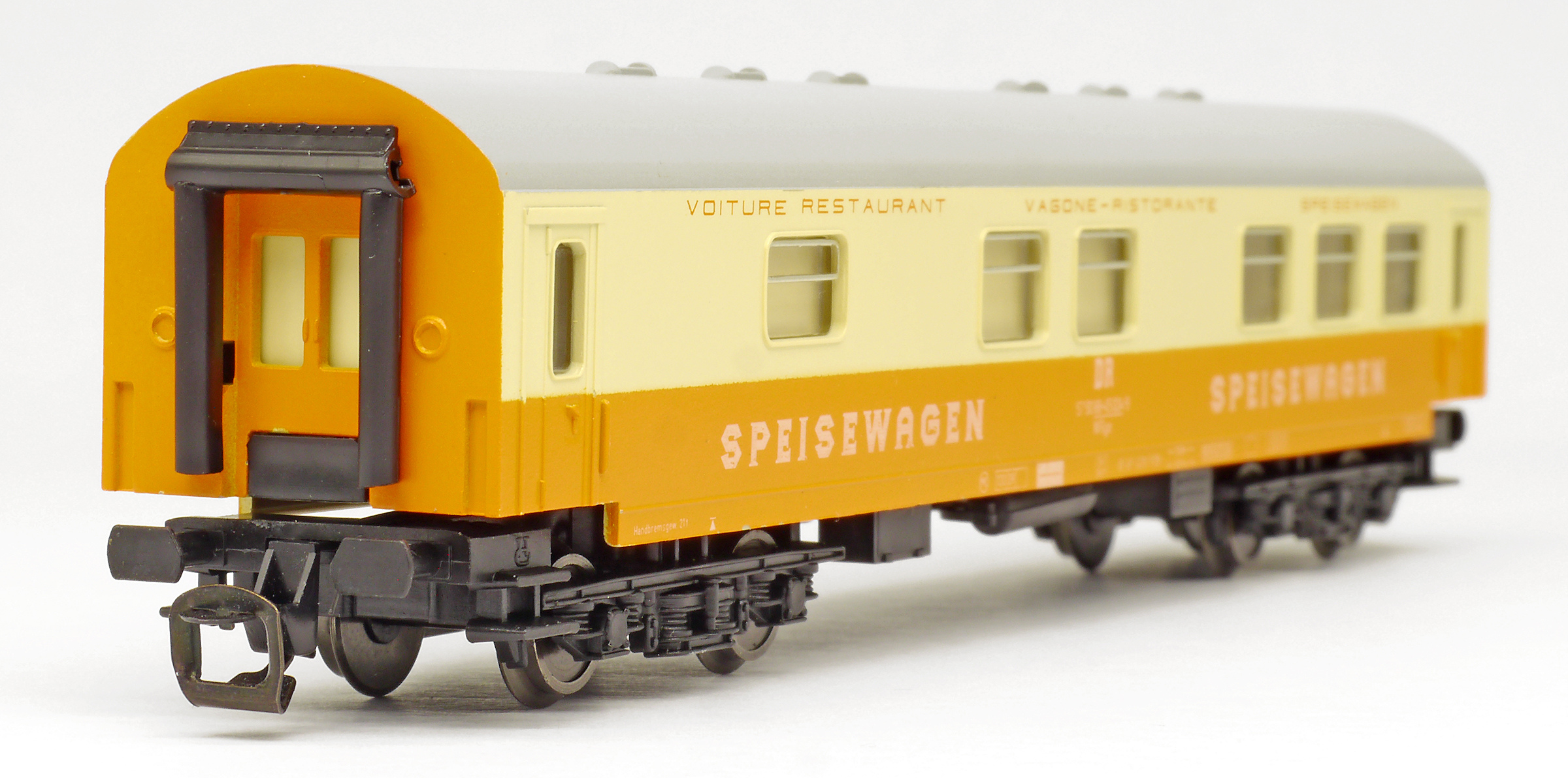 | jídelní vůz oranžový-slonová kost s šedou střechou „MITROPA“ |