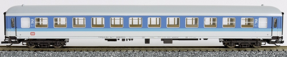 Popis   modrý-bílý se světlešedou střechou rychlíkový vůz typ m 2. tř.