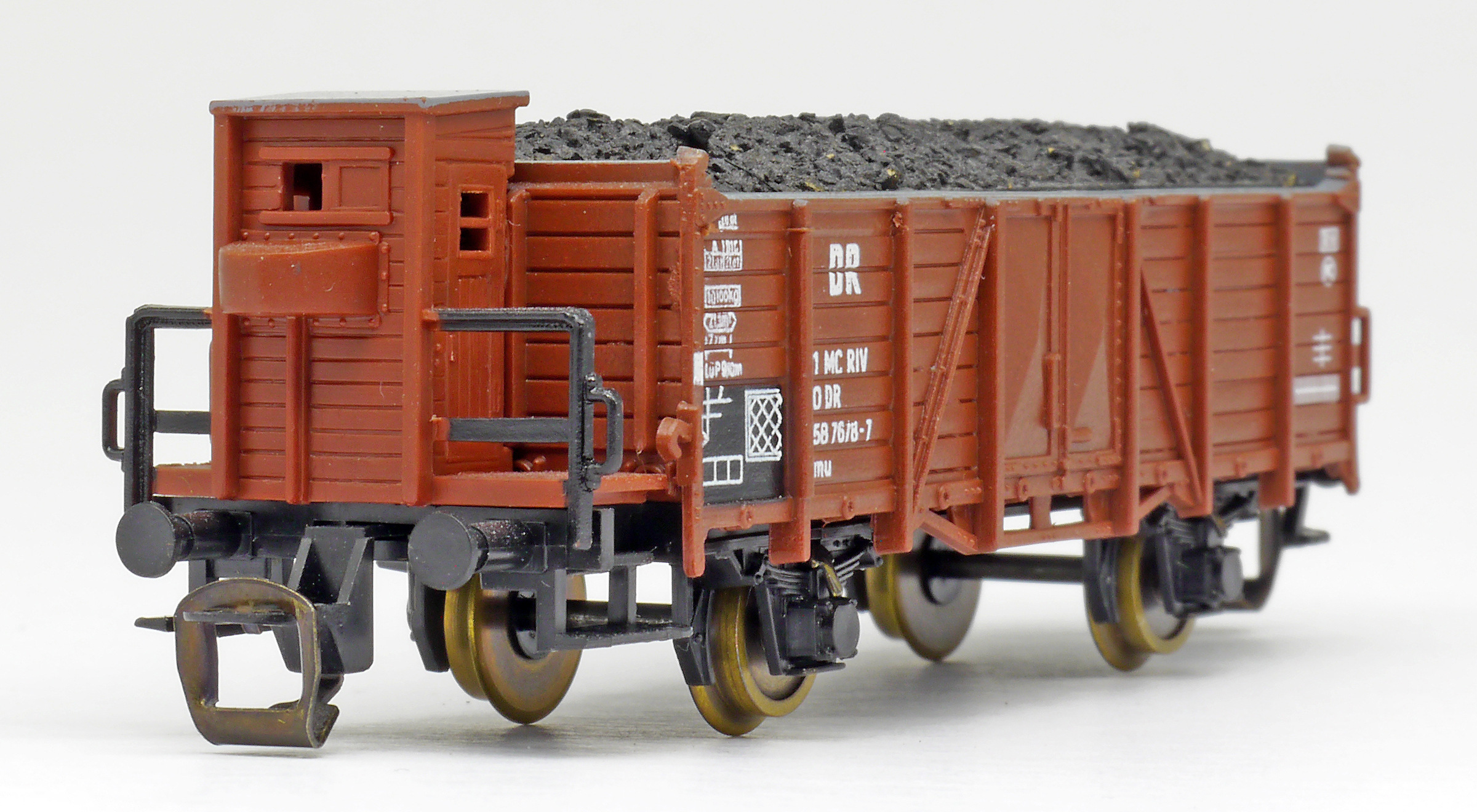 | otevřený nákladní vůz červenohnědý s brzdařskou budkou a nákladem uhlí |