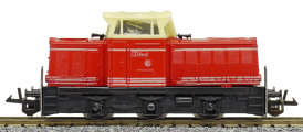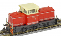 | dieselová lokomotiva červená s bílými proužky, krémová budka, černý rám a pojezd |