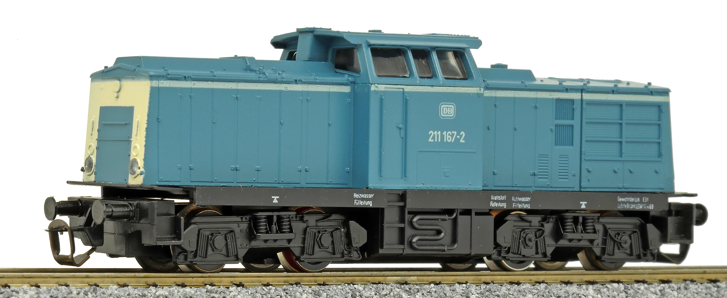 | dieselová lokomotiva modrá s bílým čelem, černý rám a pojezd |