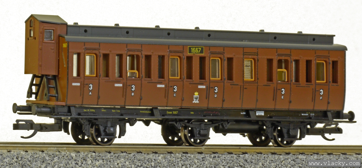 Popis   oddílový osobní vůz červenohnědý s černou střechou a brzdařskou budkou 3. tř.