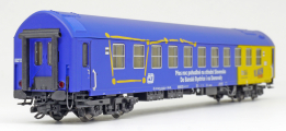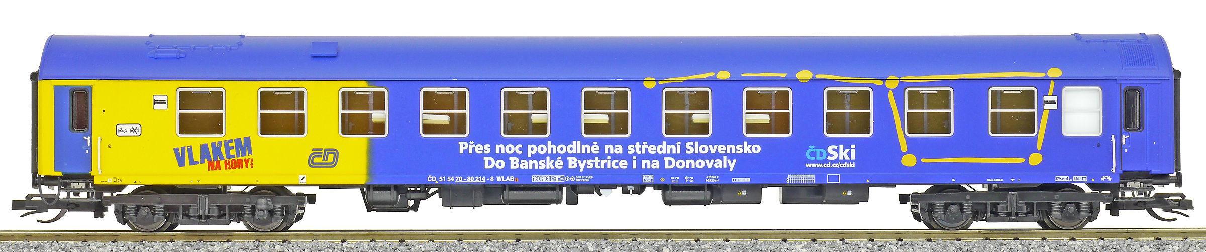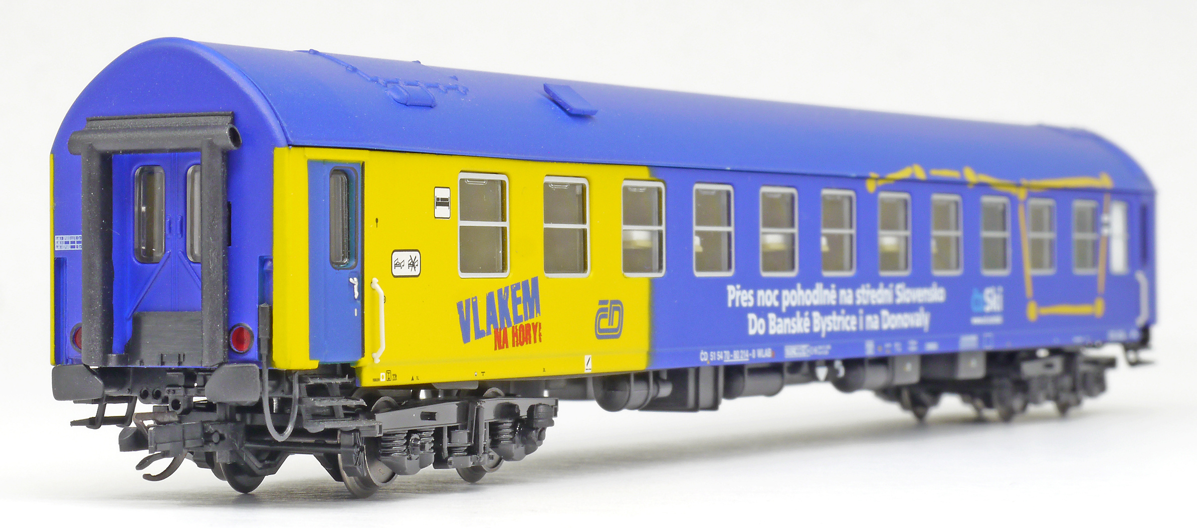 | lůžkový vůz modrý-žlutý s reklamním potiskem |