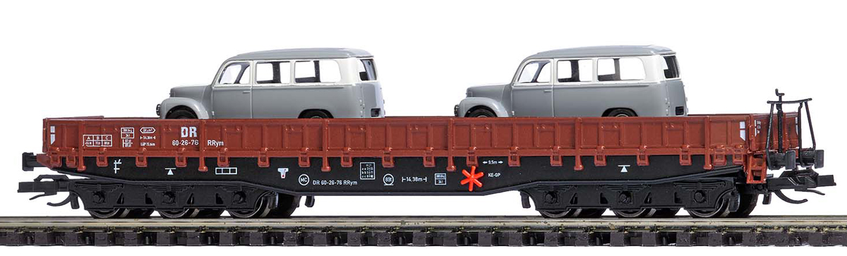 | nízkostěnný vůz červenohnědý s nákladem dvou minibusů Framo |