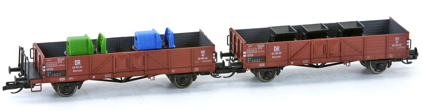 | set dvou otevřených nákladních vůz s nákladem lokomotiv a vozů polní dráhy |