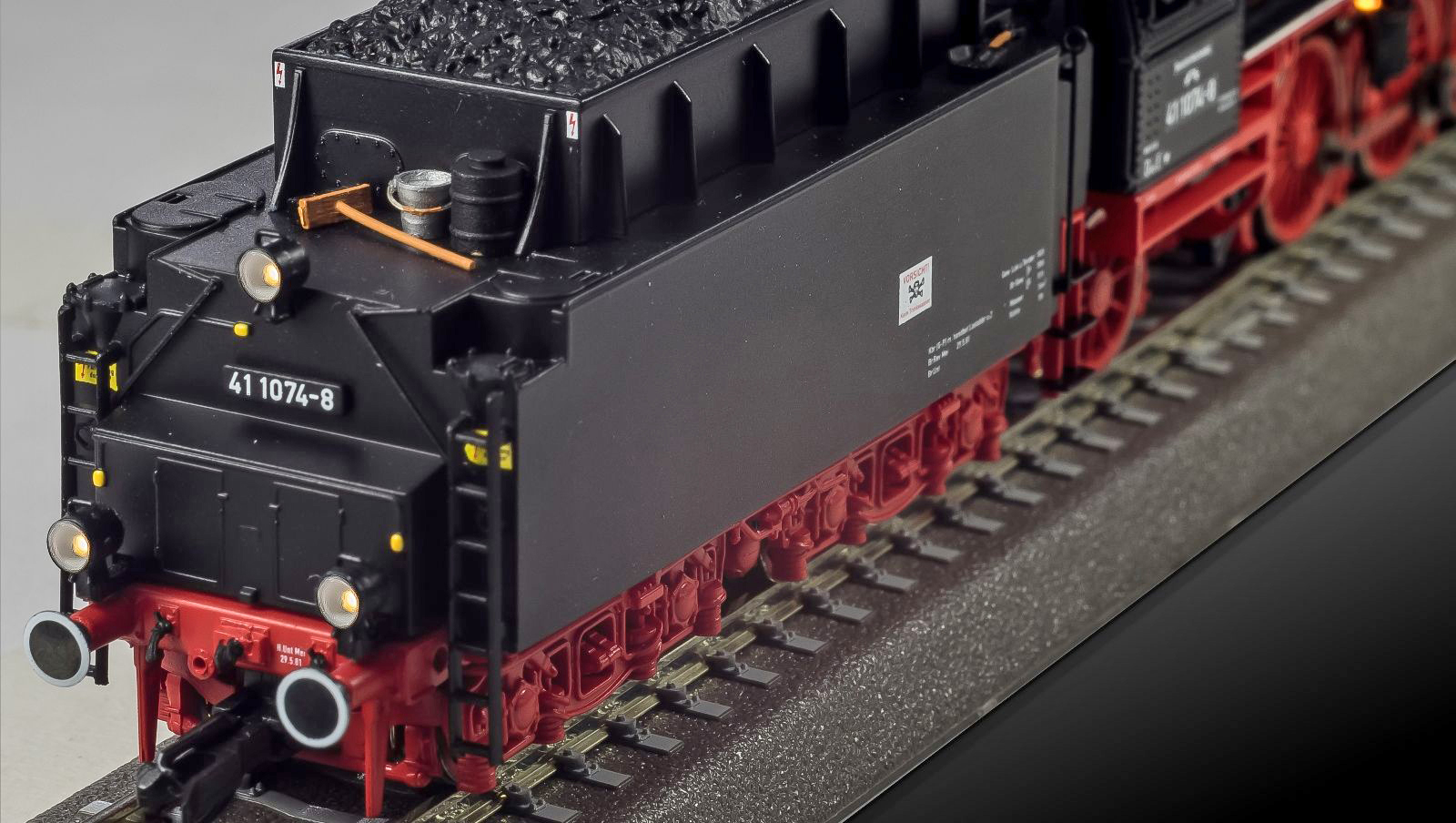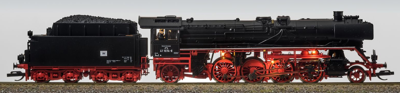 | parní lokomotiva černá s červeným pojezdem a kouřovými plechy BR 41 Reko |