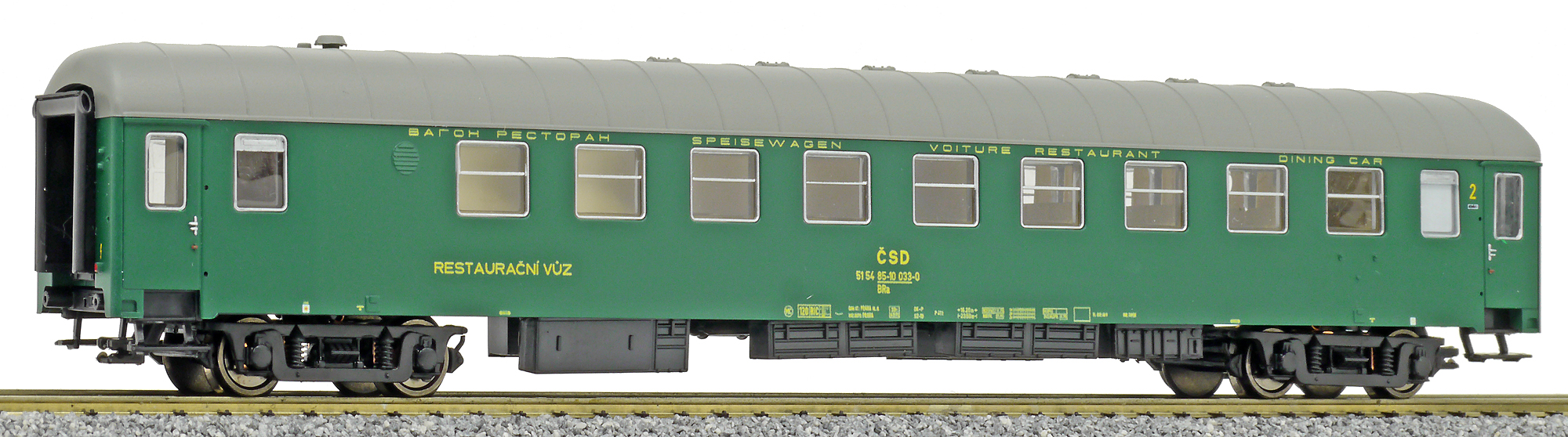 | restaurační vůz zelený s šedou střechou 2. tř., Praha |