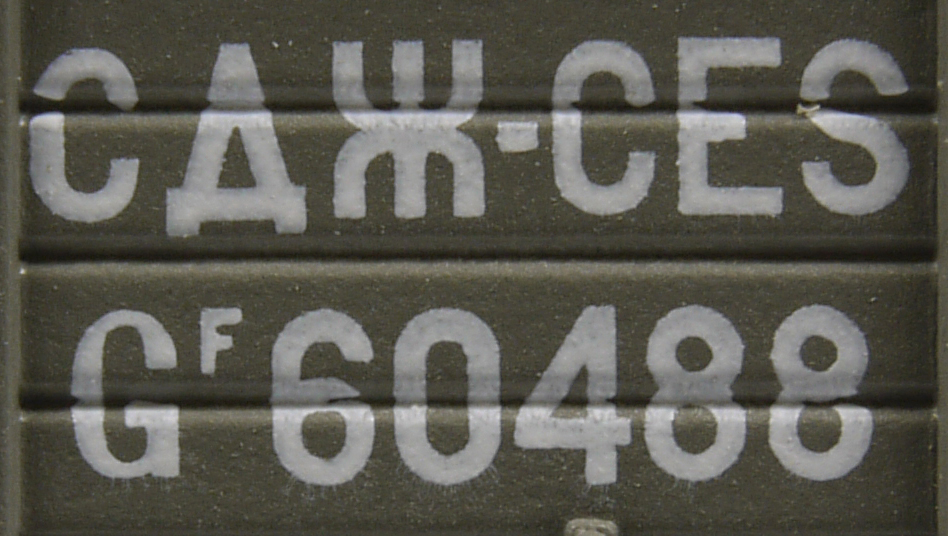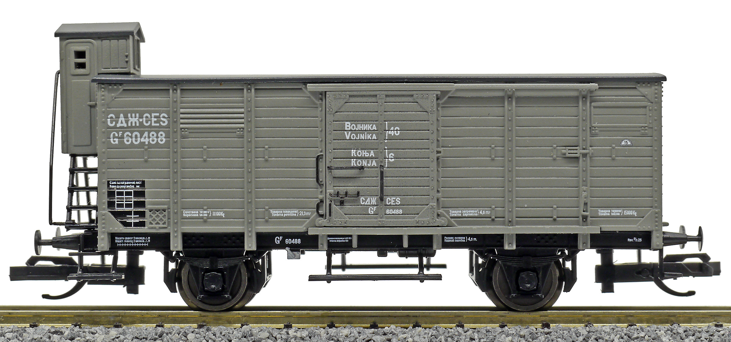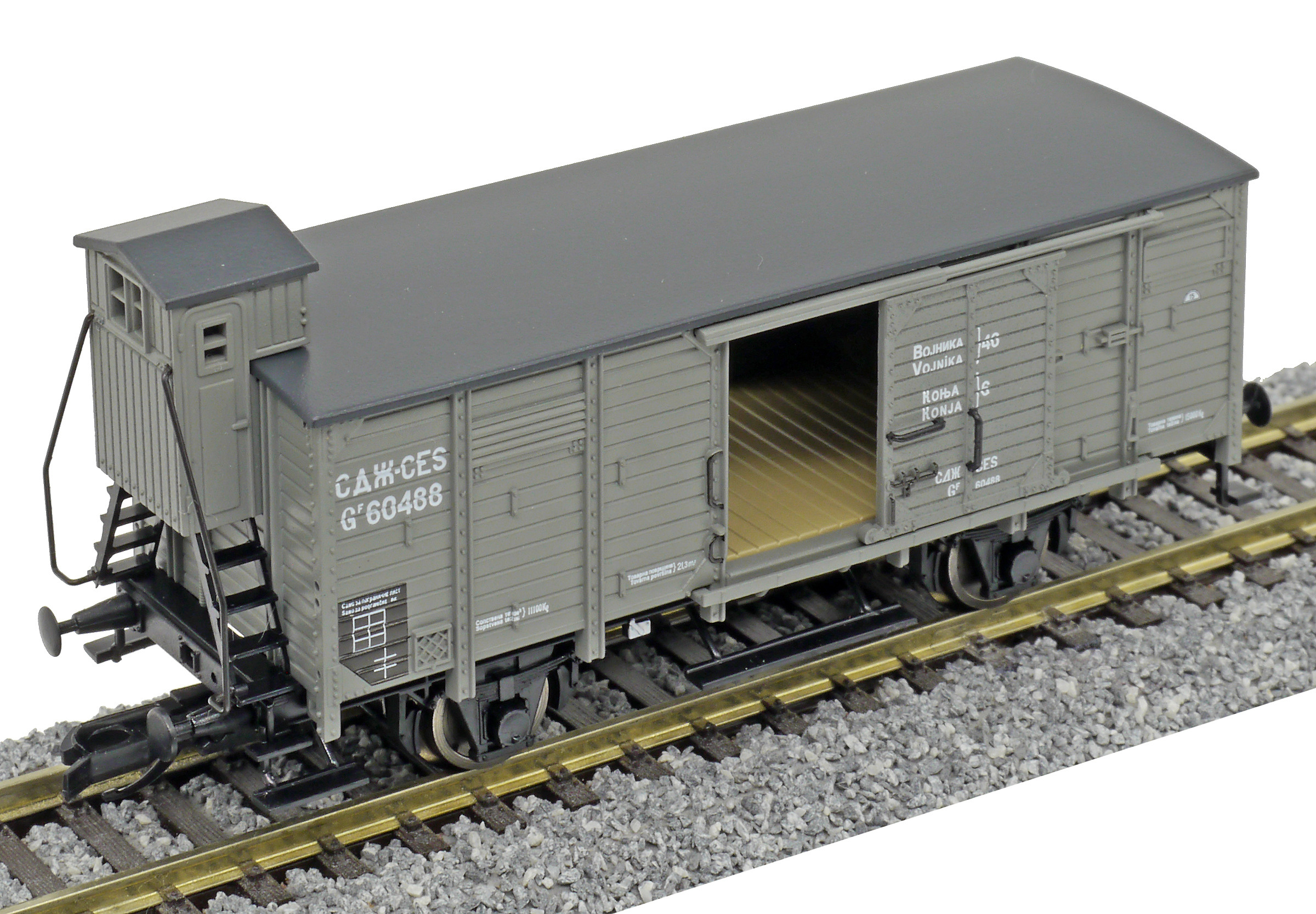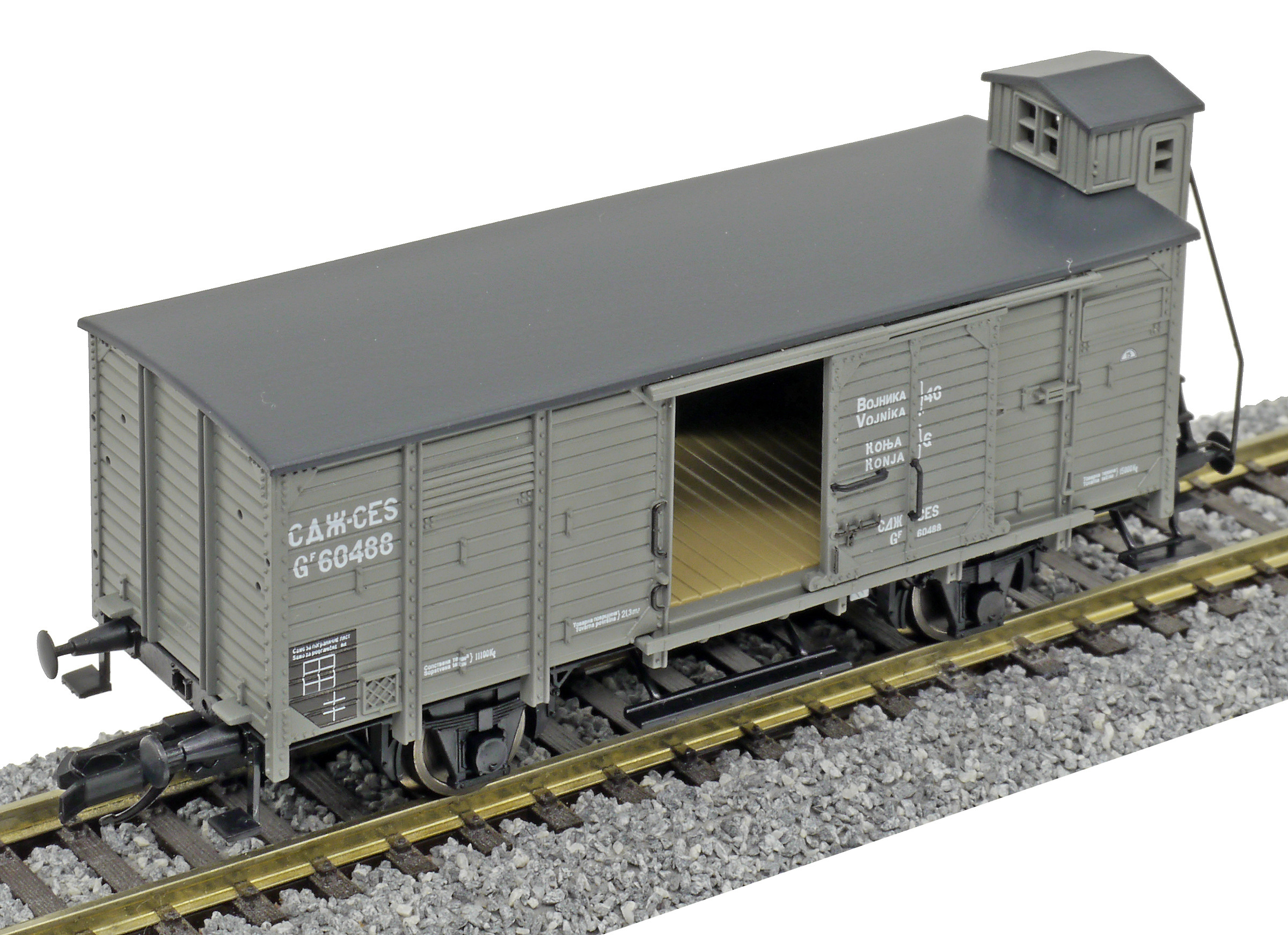 krytý nákladní vůz zelenošedý s černou střechou a s brzdařskou budkou