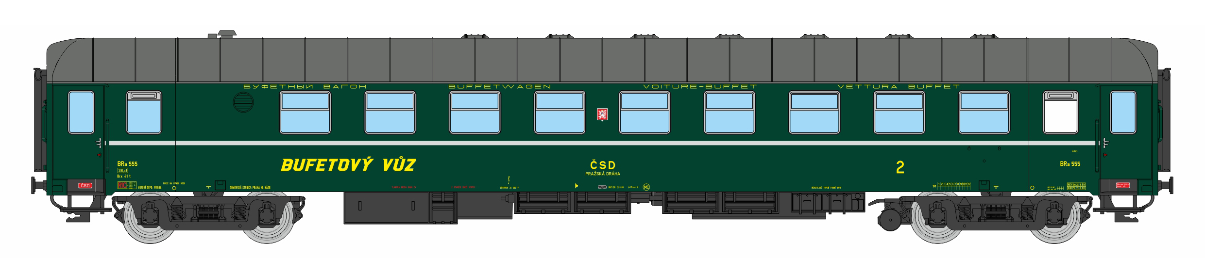 bufetový vůz zelený s šedou střechou 2. tř. se státním znakem, Praha