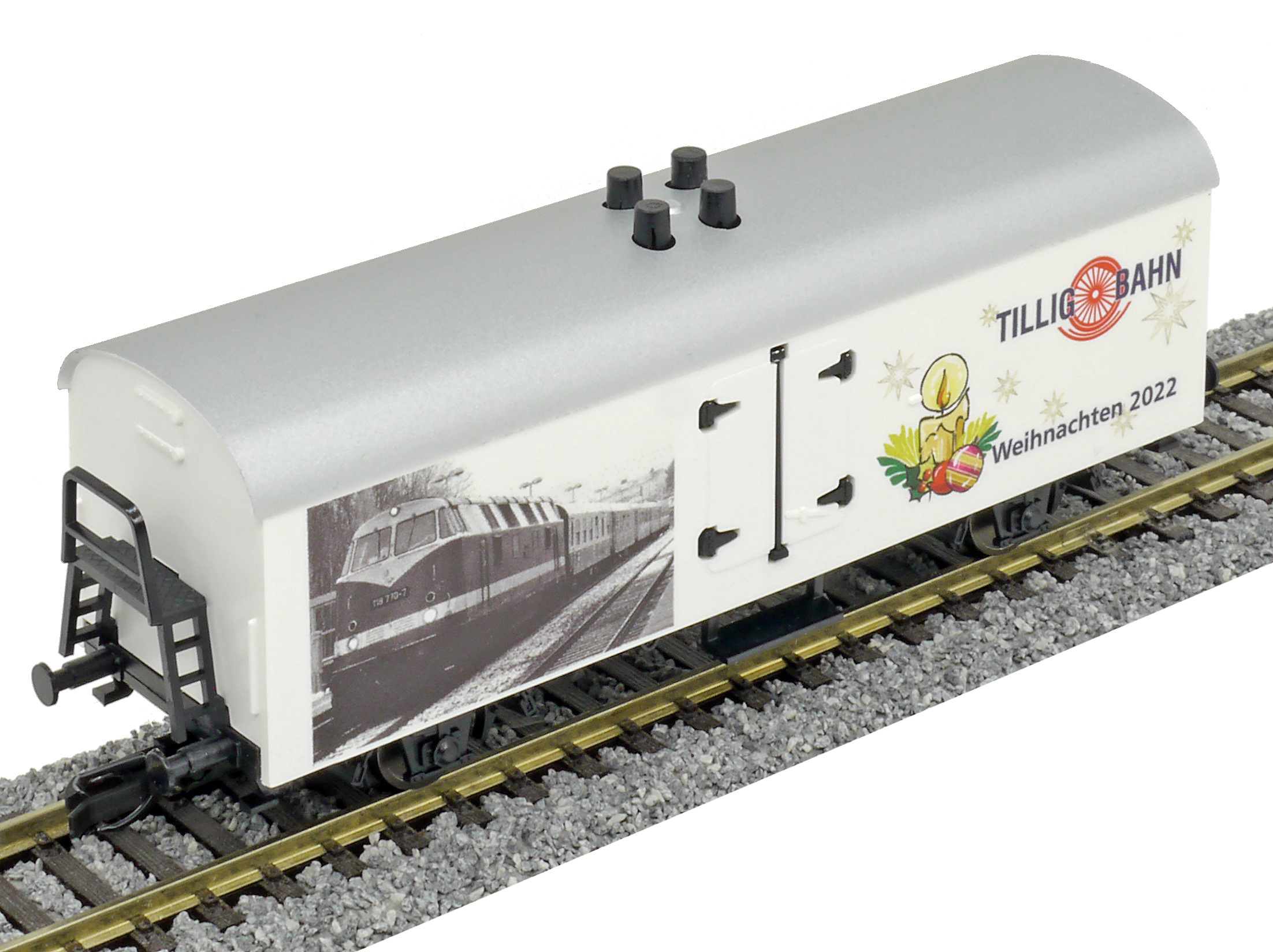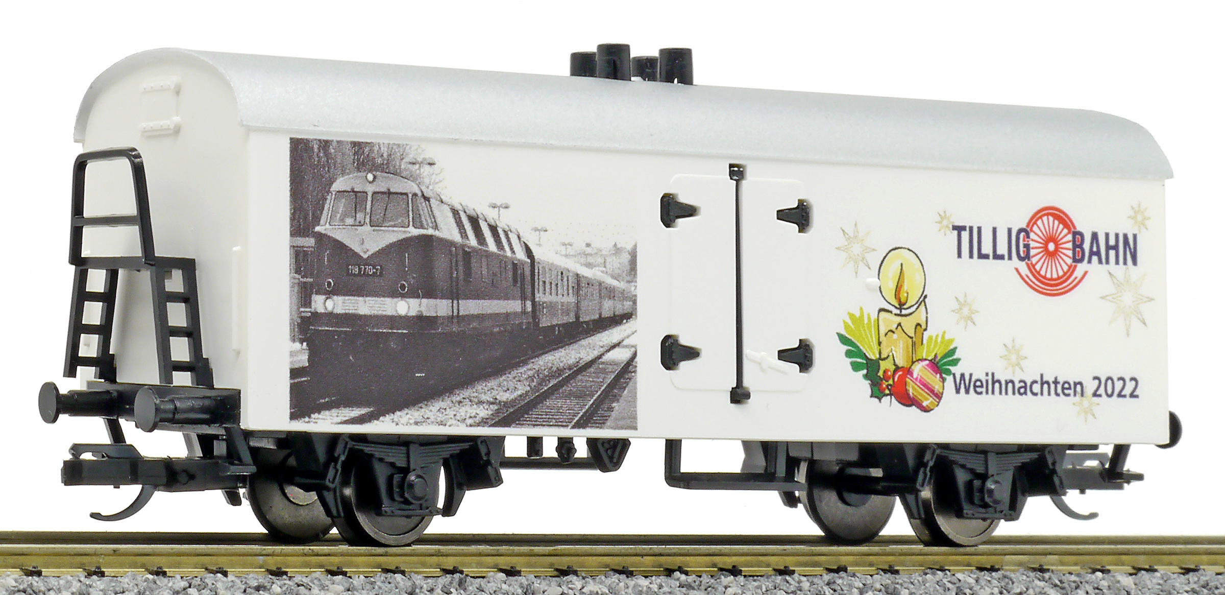 | chladící vůz bílý s šedou střechou a s reklamním potiskem „Weinachten 2022“ |