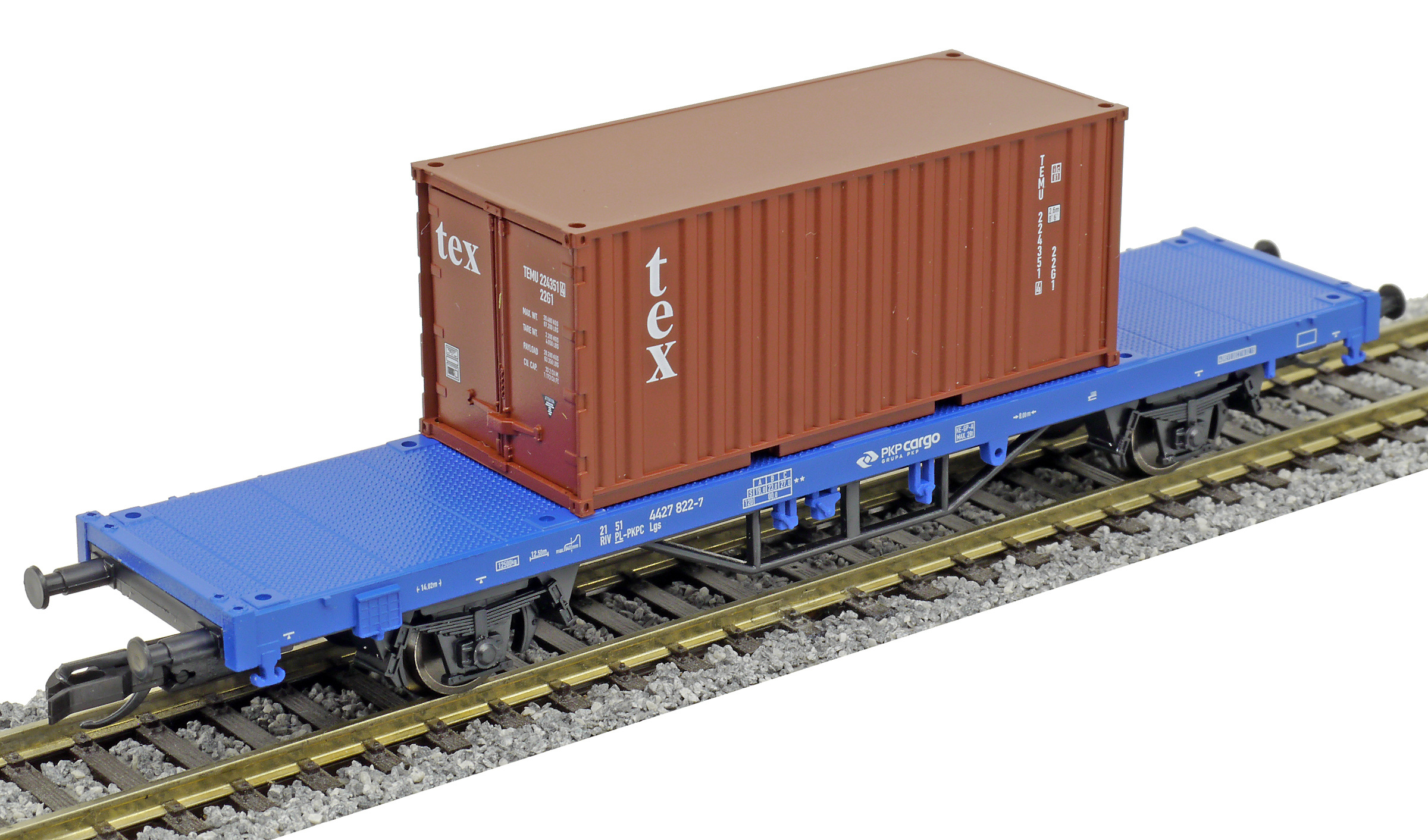 | plošinový vůz modrý s nákladem 1x 20' kontejneru „tex“ |