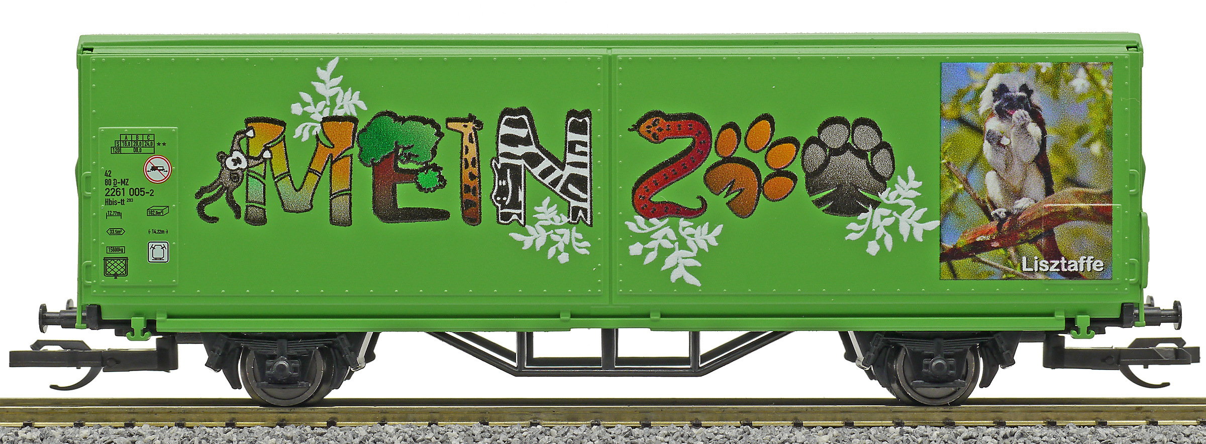 | krytý nákladní vůz s posuvnými stěnami a s reklamním potiskem „Mein Zoo” |
