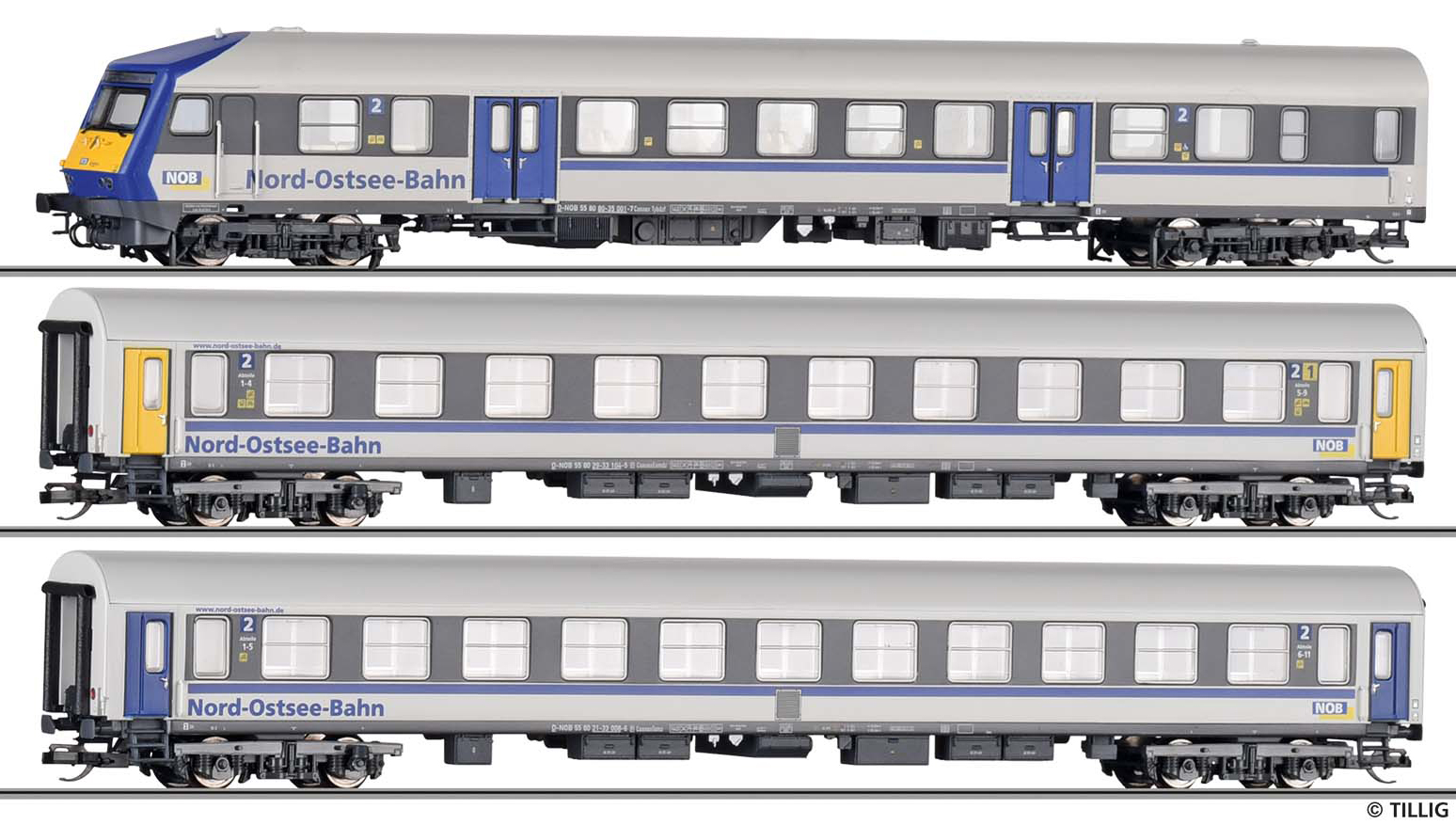 | set řídícího a dvou rychlíkových vozů v barevném schematu „Nord-Ostsee-Bahn“ |