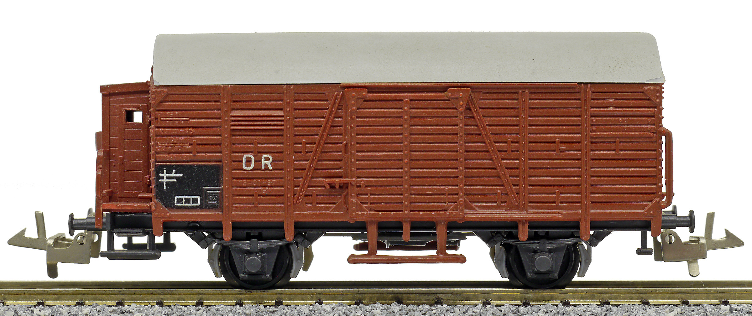 | krytý nákladní vůz červenohnědý s šedou střechou a s brzdařskou budkou |