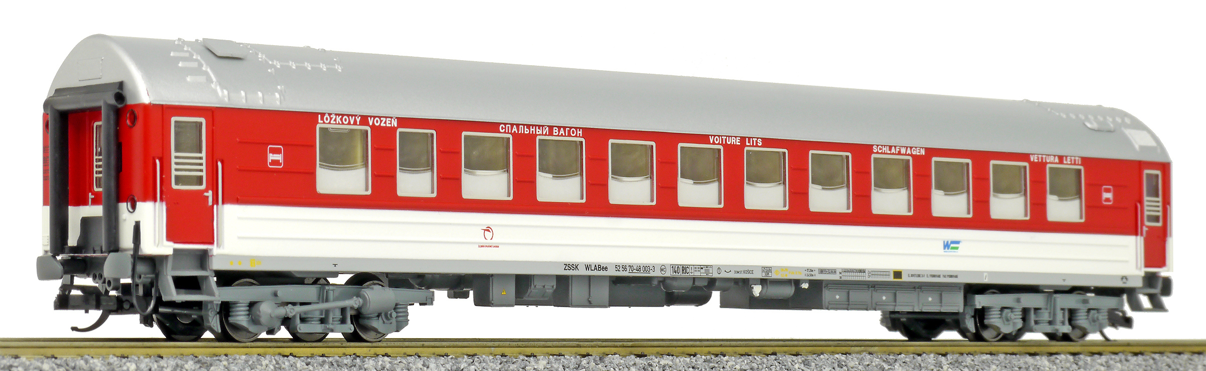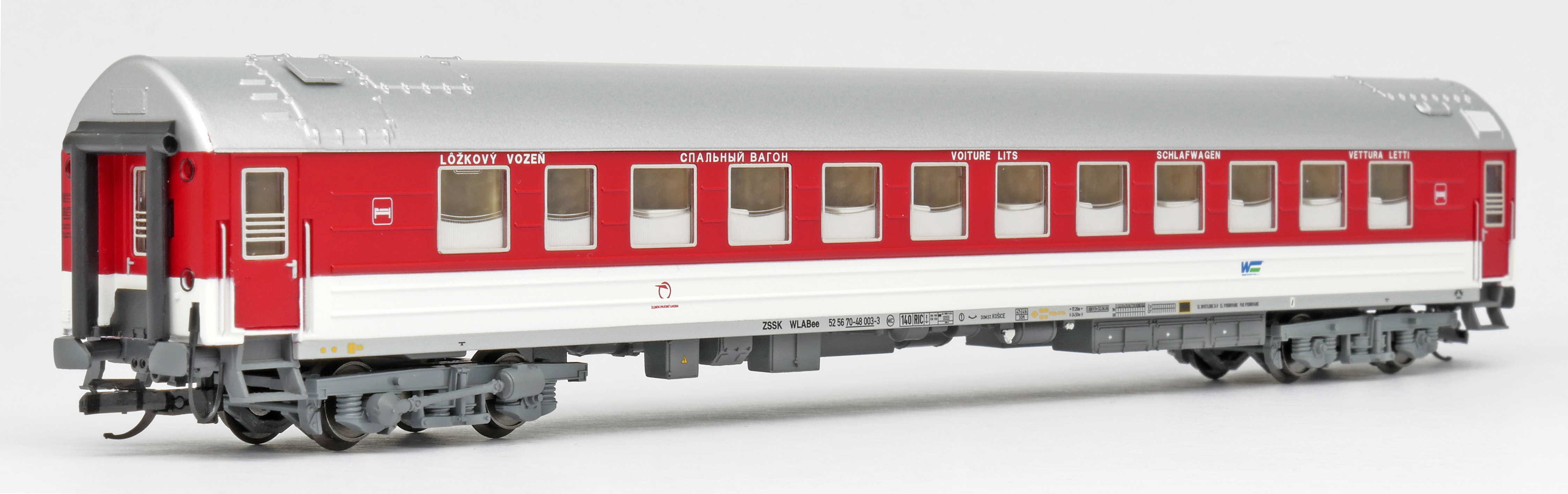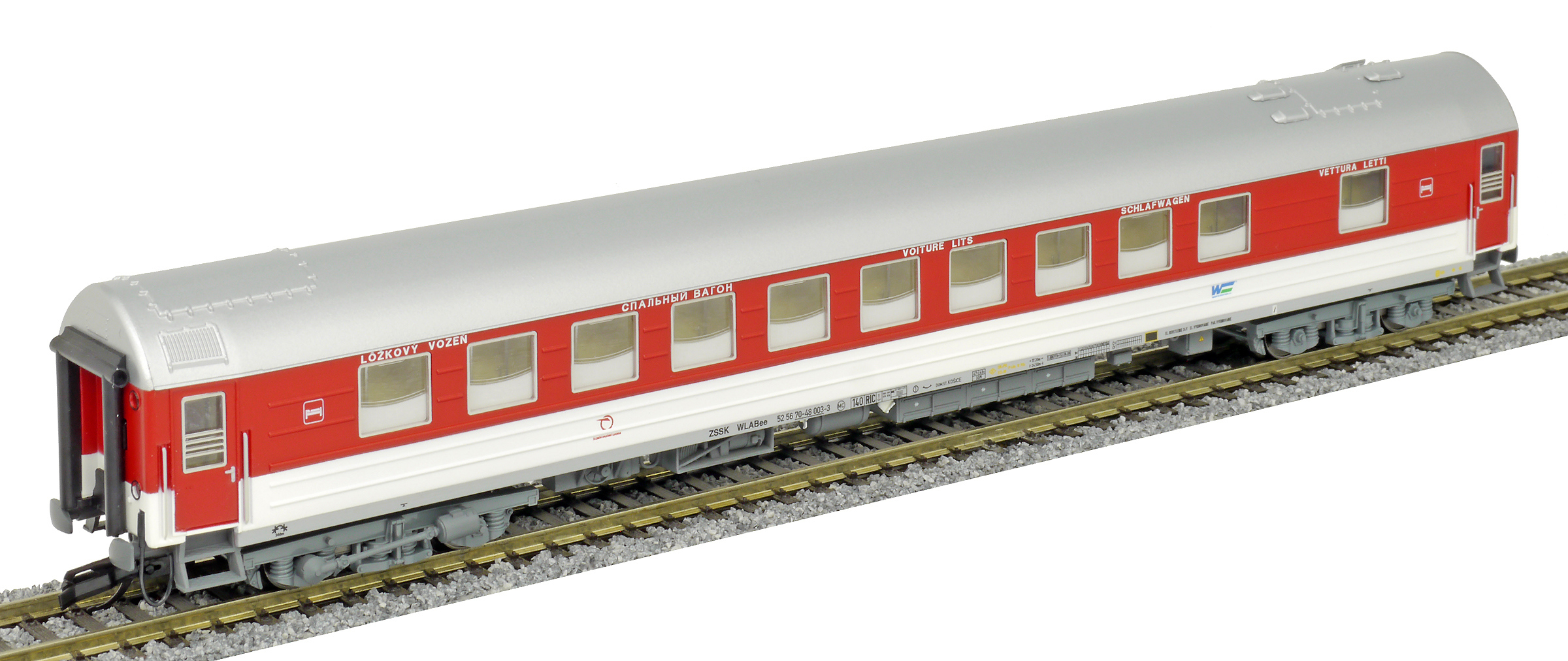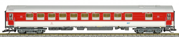 | lůžkový vůz červený-bílý s stříbřitou střechou |