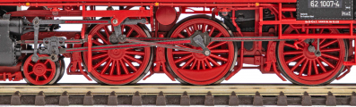 | parní lokomotiva černá s červeným pojezdem a kouřovými plechy |