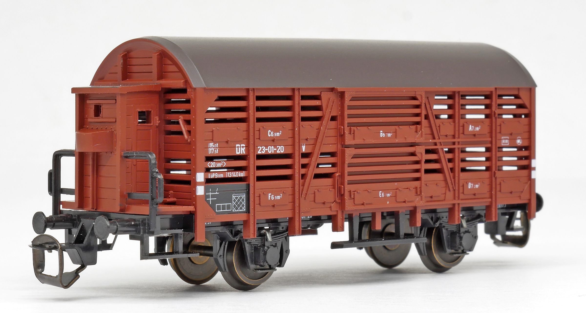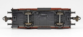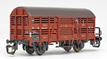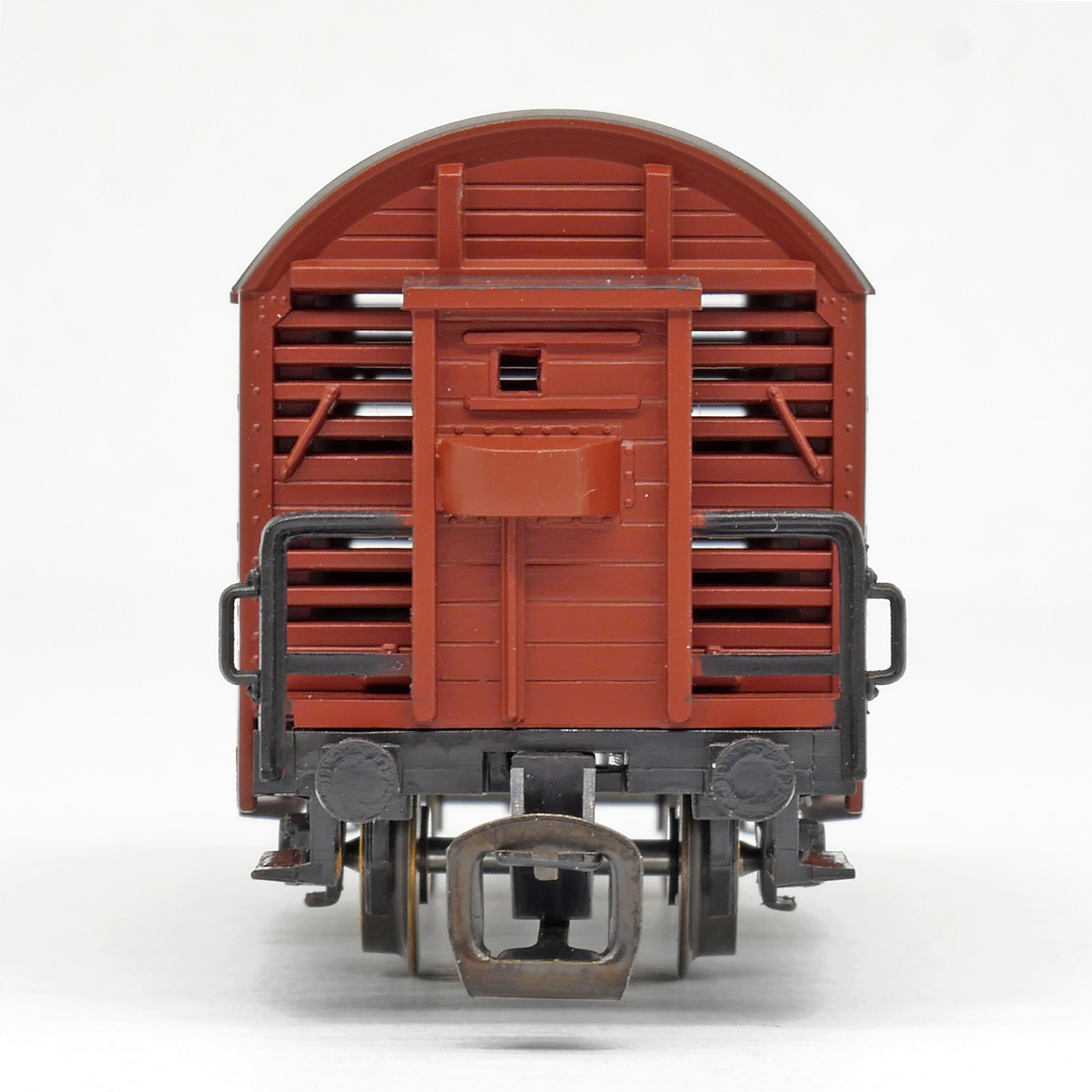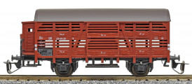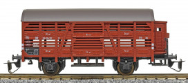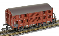 | nákladní vůz na přepravu drobného zvířectva červenohnědý s tmavě hnědou střechou a s brzdařskou budkou |