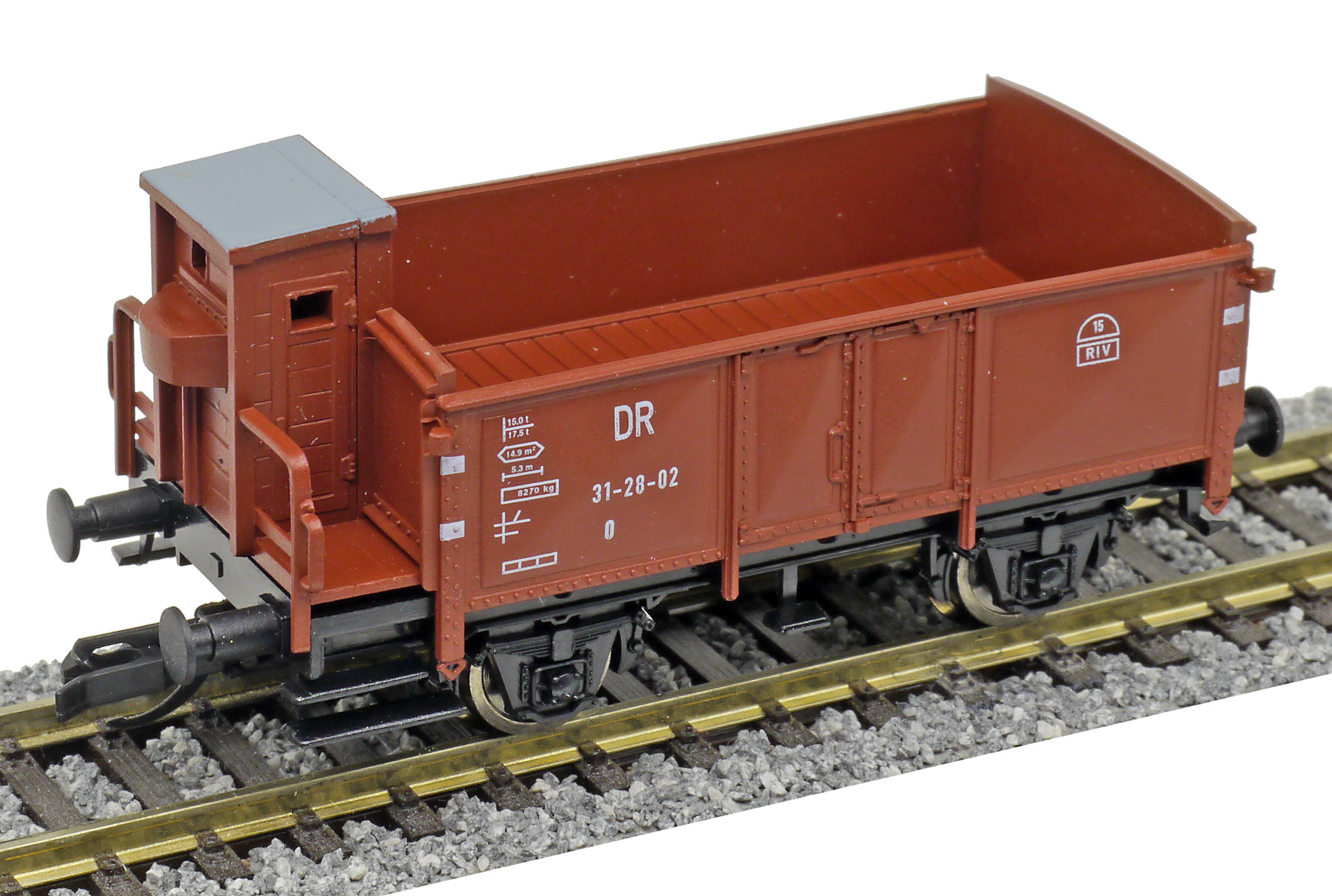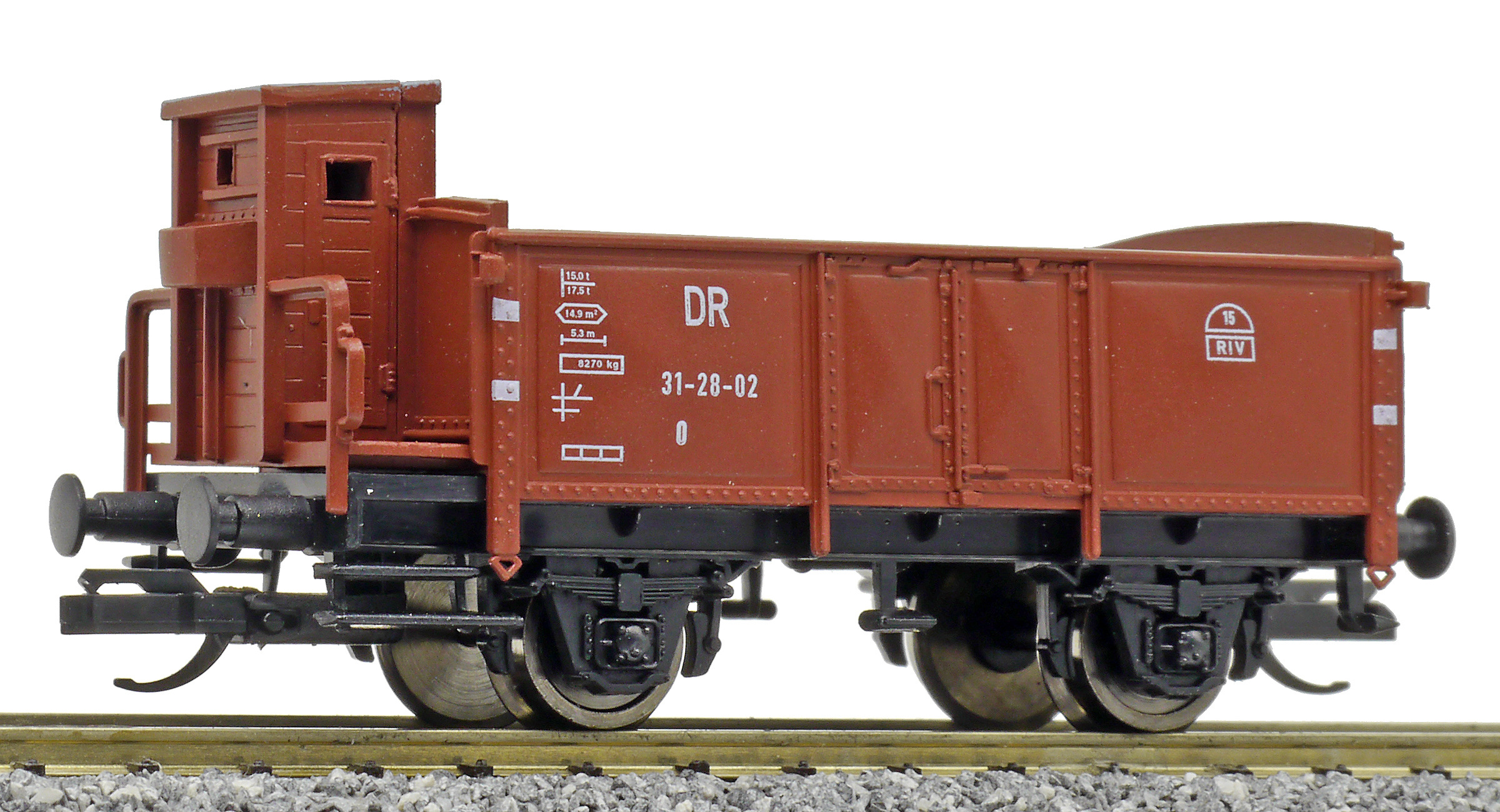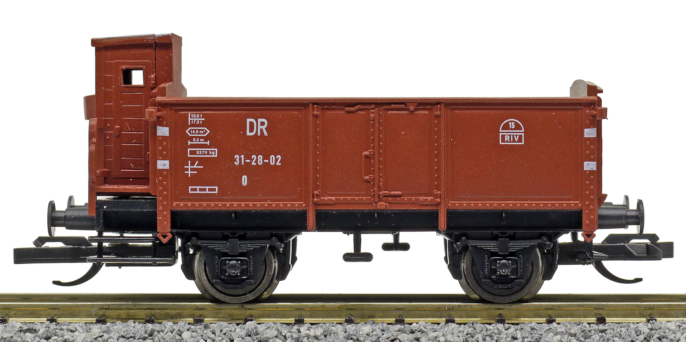| otevřený nákladní vůz červenohnědý s černým pojezdem a brzdařskou budkou |