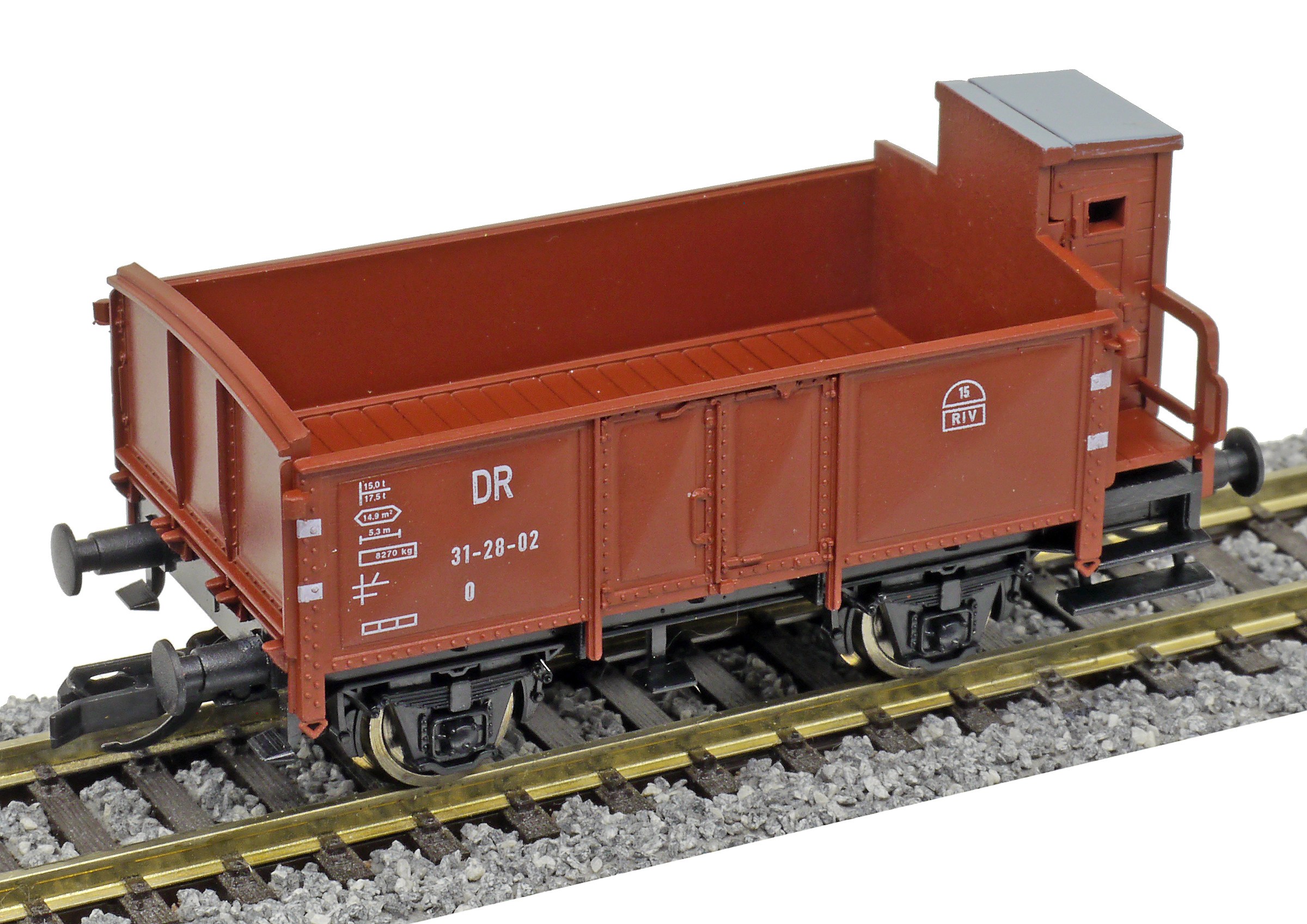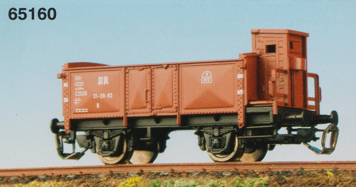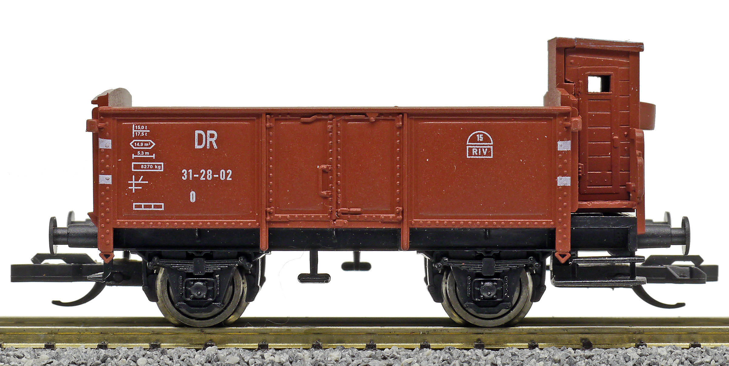 | otevřený nákladní vůz červenohnědý s černým pojezdem a brzdařskou budkou |