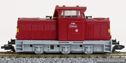 | dieselová lokomotiva červená s šedým pojezdem a výstražným žlutým pruhem |