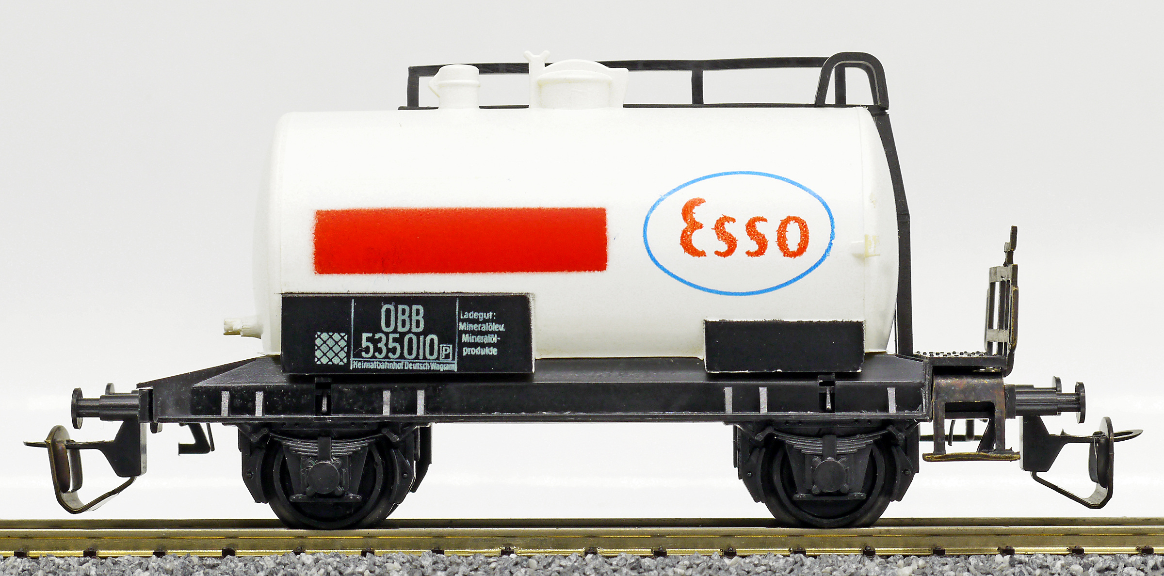 kotlový vůz bílý s červeným pruhem a s logem „Esso“