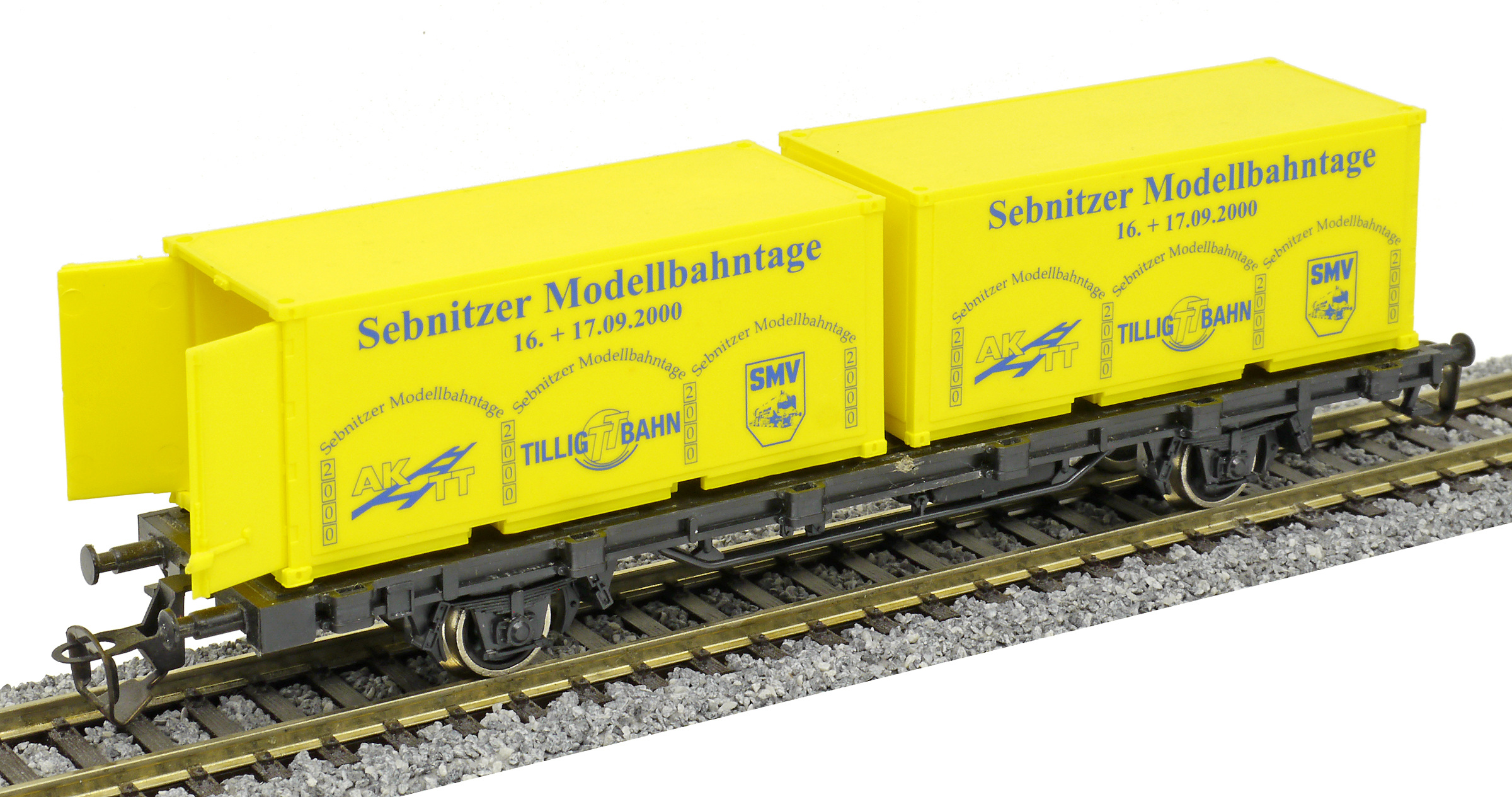 | plošinový vůz se dvěma žlutými kontejnery 20' s reklamním potiskem „AKTT“ |