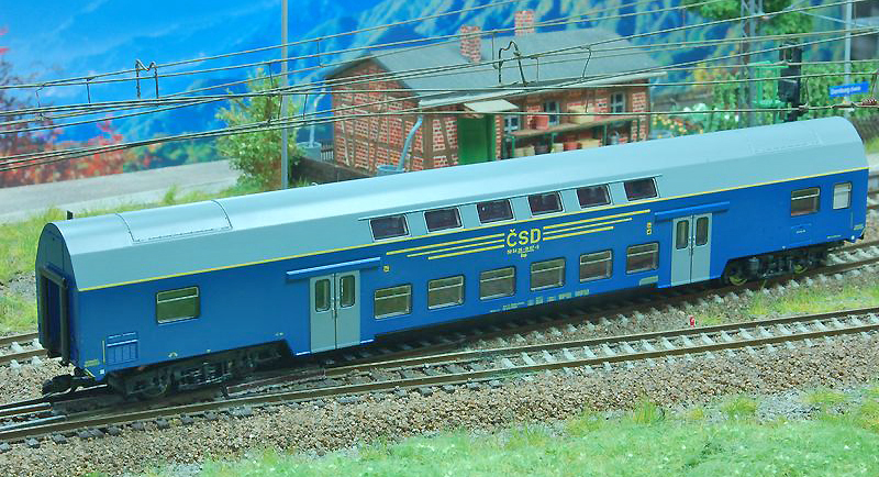 | středový patrový vůz modrý s šedou střechou 2. tř., žluté popisy |