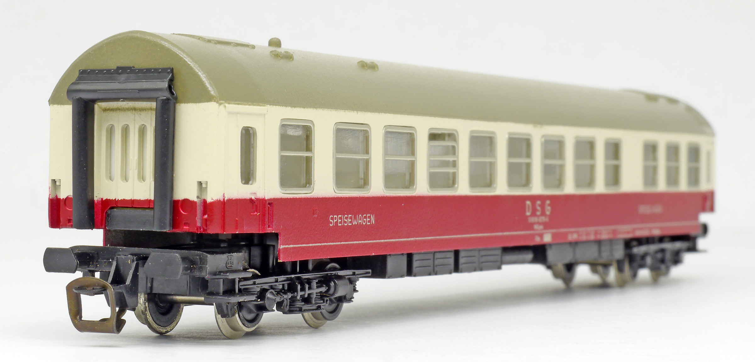 | jídelní vůz červený-slonová kost s šedou střechou |