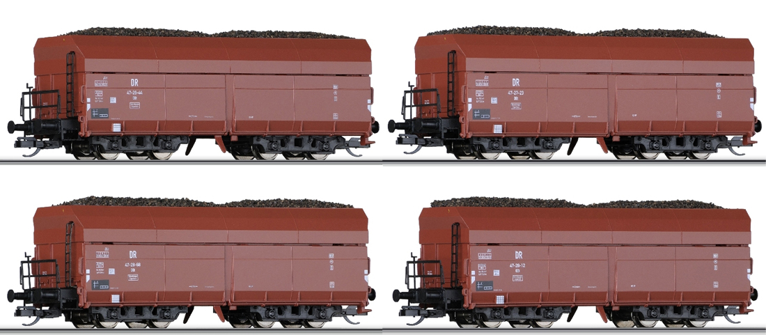 | nákladní samovýsypný vůz červenohnědý s nákladem uhlí, set 4 vozů |