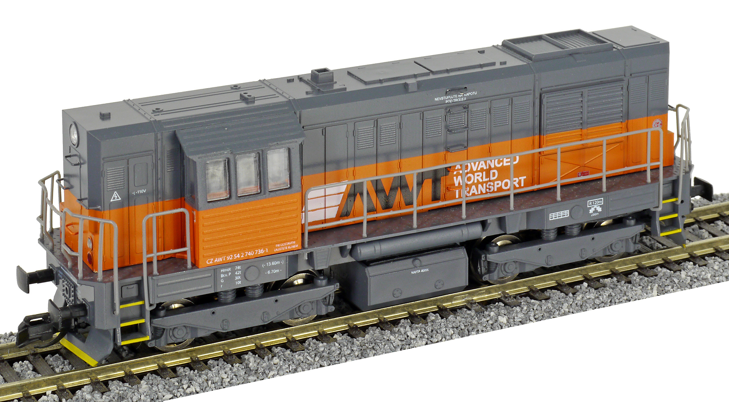 | dieselová lokomotiva tmavě šedá s oranžovým pásem „AWT“ |