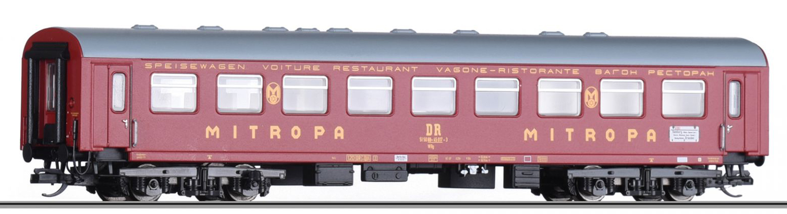 | jídelní vůz vínově červený s šedou střechou „Mitropa“ |
