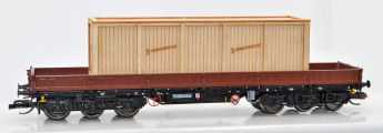 | nízkostěnný nákladní vůz červenohnědý s černým rámem a s nákladem bedny „Wartburg” |
