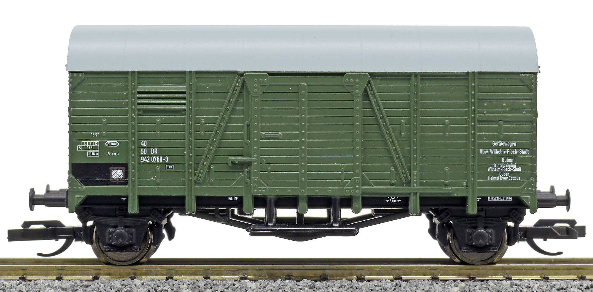 | krytý nákladní vůz zelený s šedou střechou do pracovního vlaku |