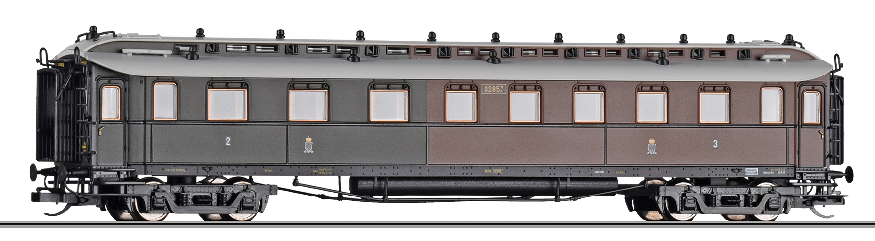 Popis   osobní vůz čevený-zelený s šedou střechou „Preußischer Schnellzug“ 2/3. tř.