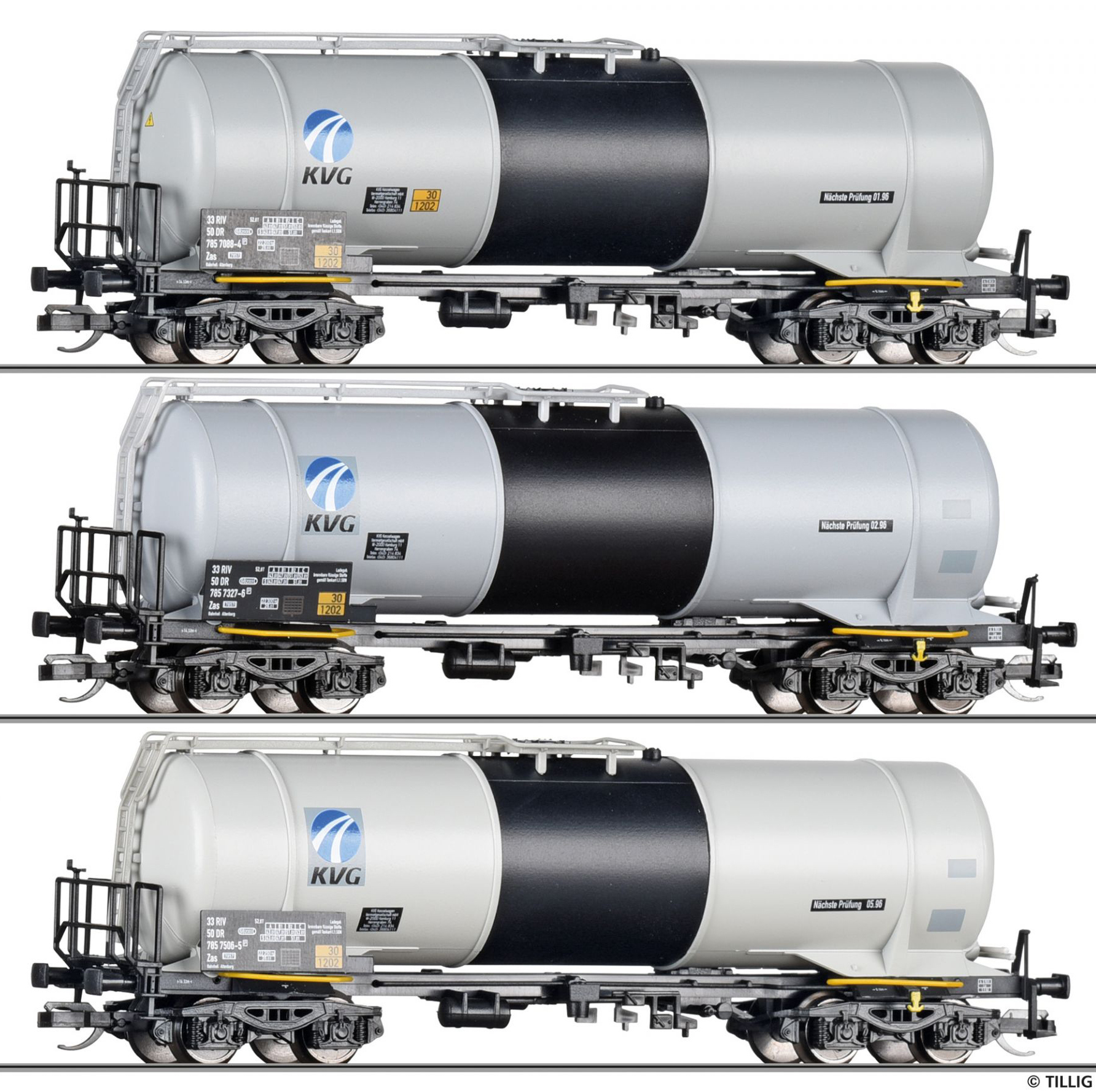 | set tří šedý kotlových vozů s černým pásem a s logem „KVG“ |