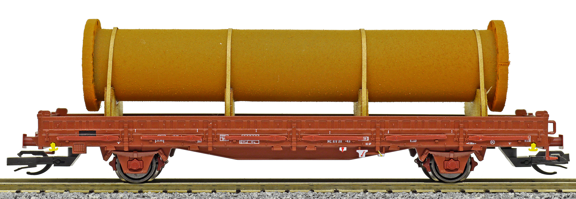 | nízkostěnný nákladní vůz červenohnědý s klanicemi s nákladem přírubové trubky |