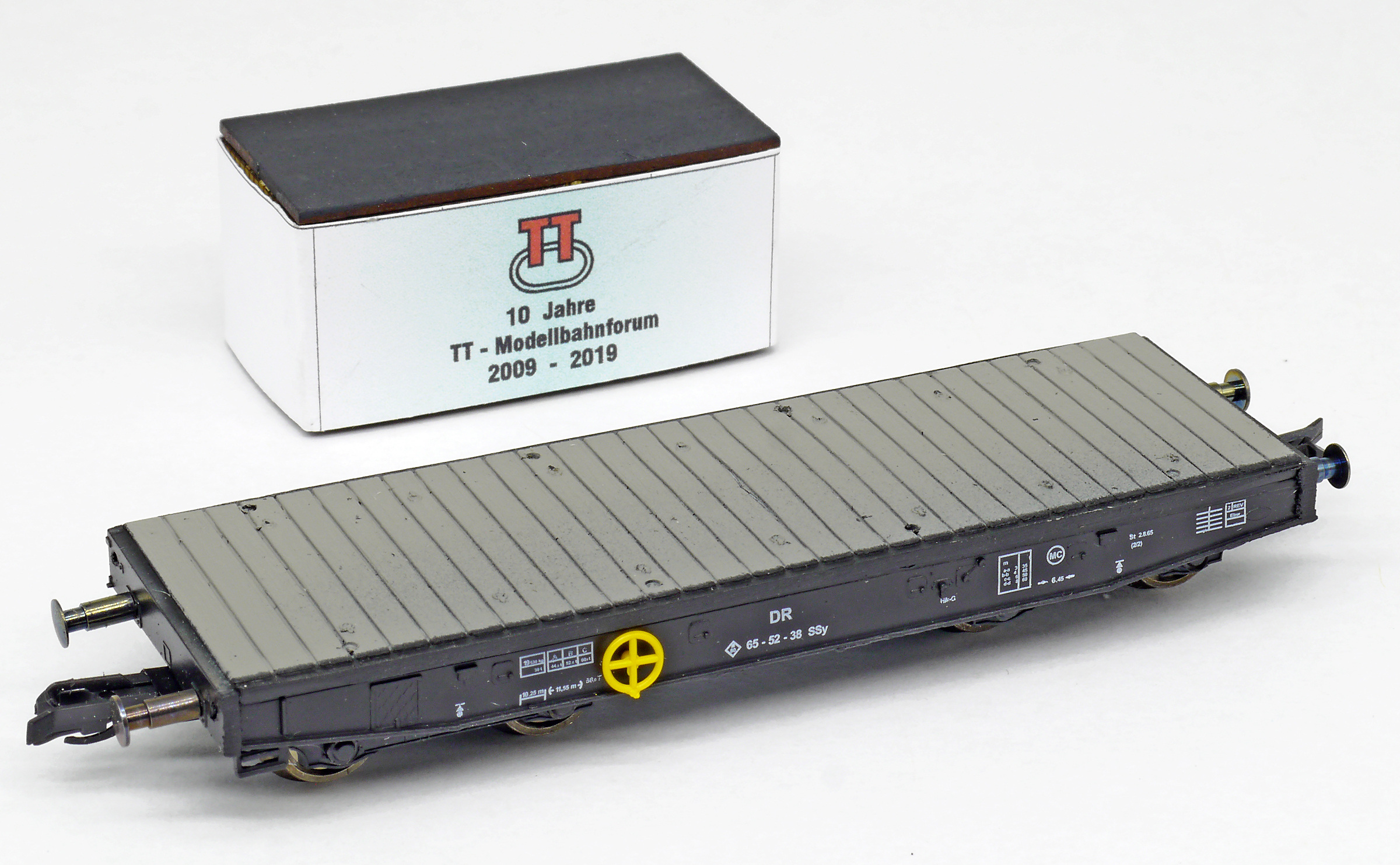 | plošinový nákladní vůz černý s nákladem bedny „10 Jahre TT-Modellbahnforum 2009 - 2019“ |
