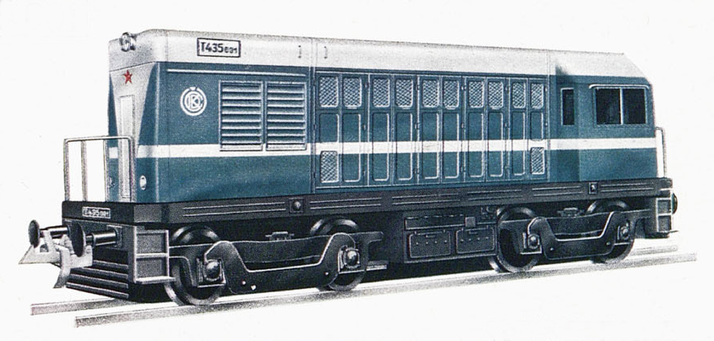 dieselová lokomotiva modrá s šedou střechou, černý rám a pojezd