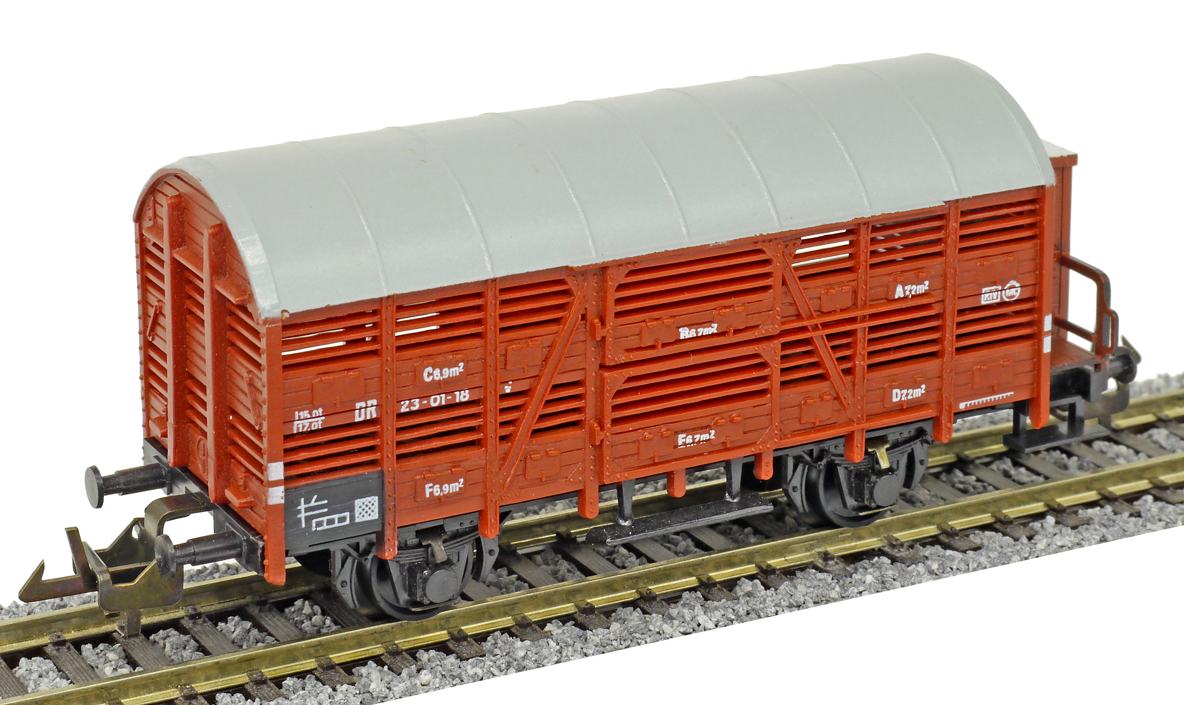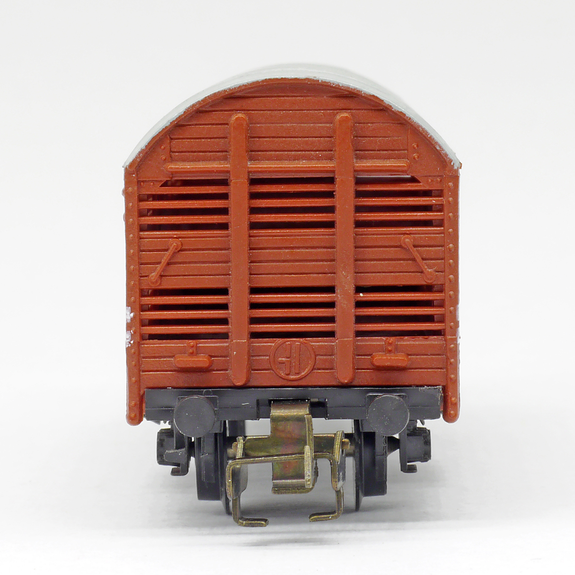 | nákladní vůz na přepravu zvířat červenohnědý s šedou střechou a s brzdařskou budkou |