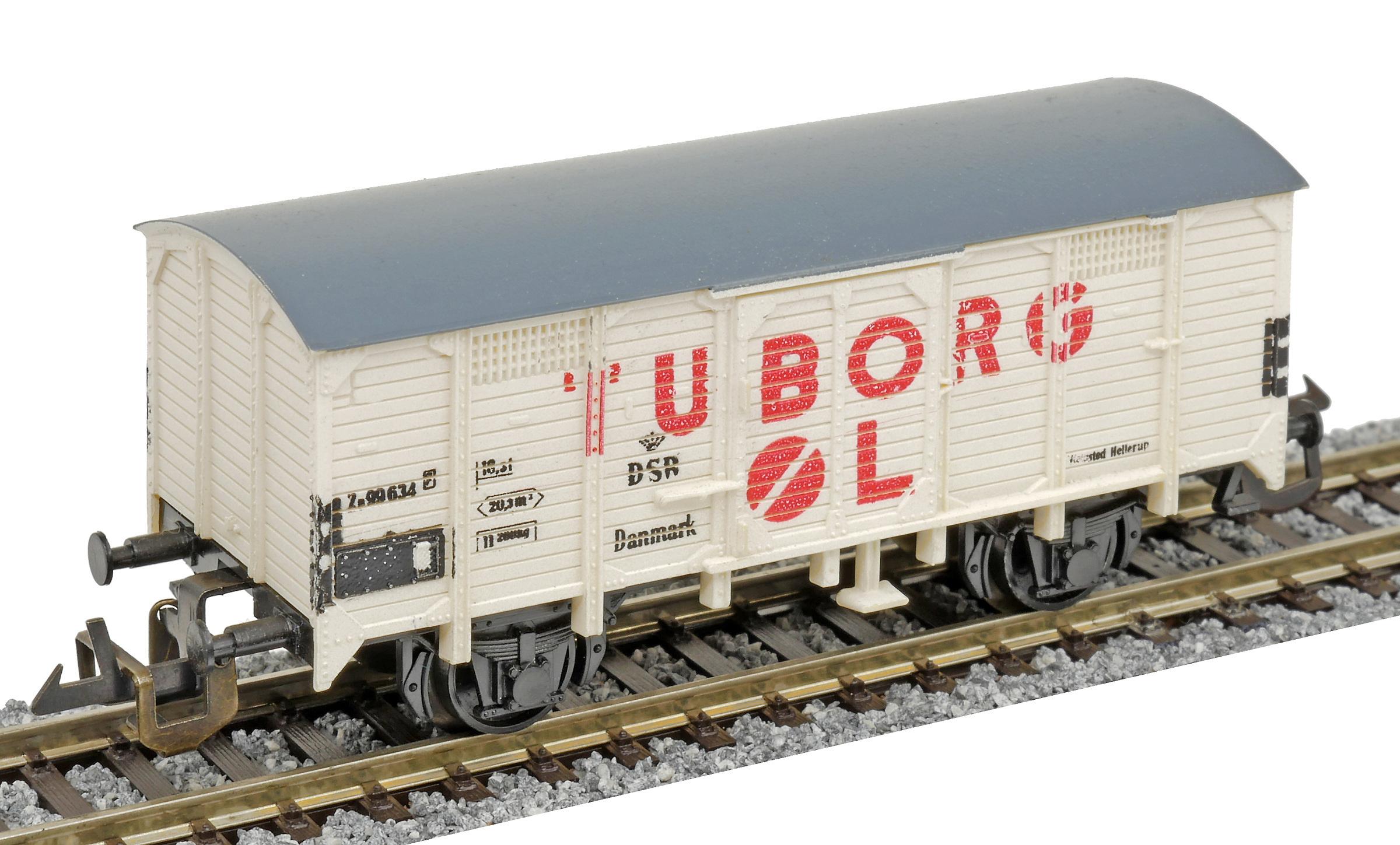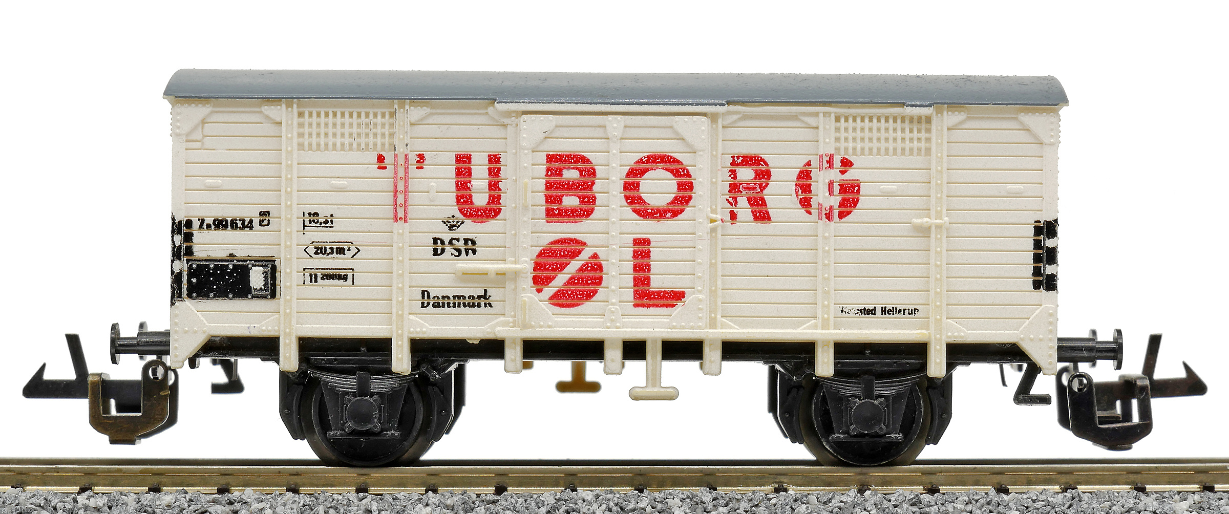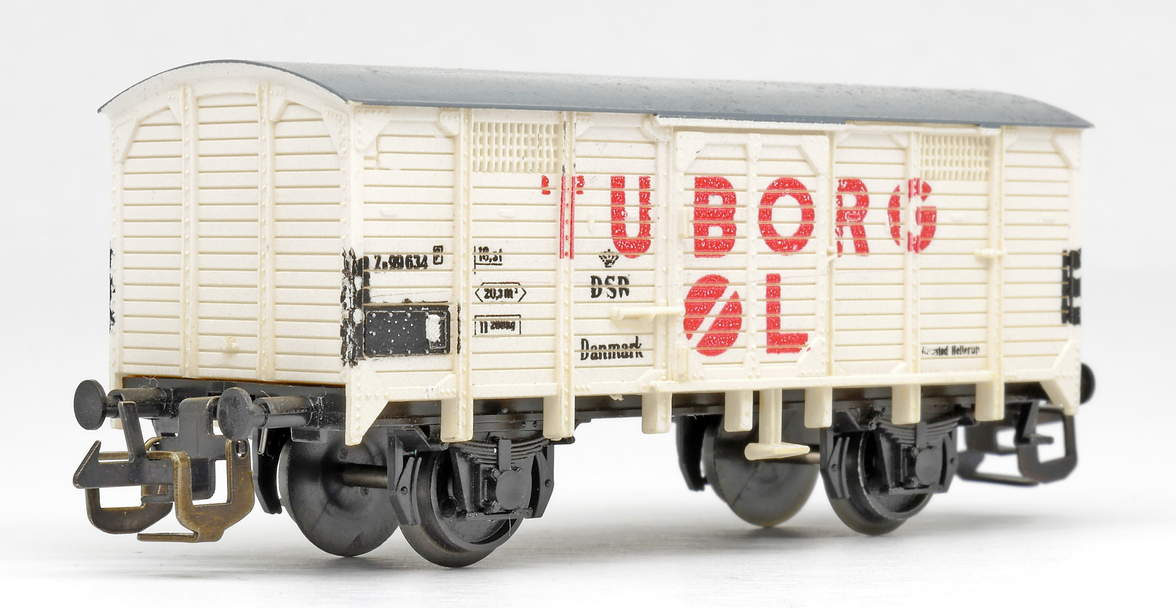 | krytý nákladní vůz bílý s šedou střechou „TUBORG ØL“ |