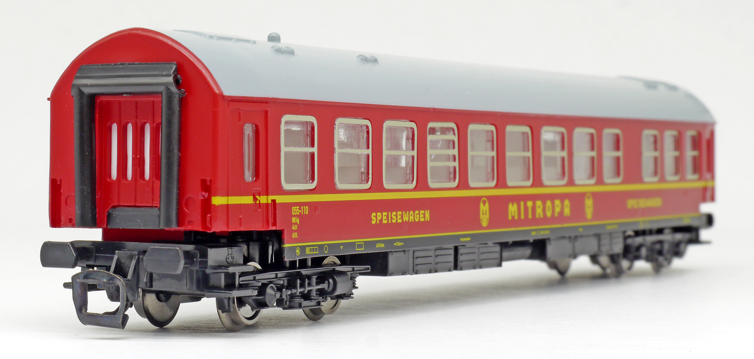 | jídelní vůz červený s šedou střechou „MITROPA“ |