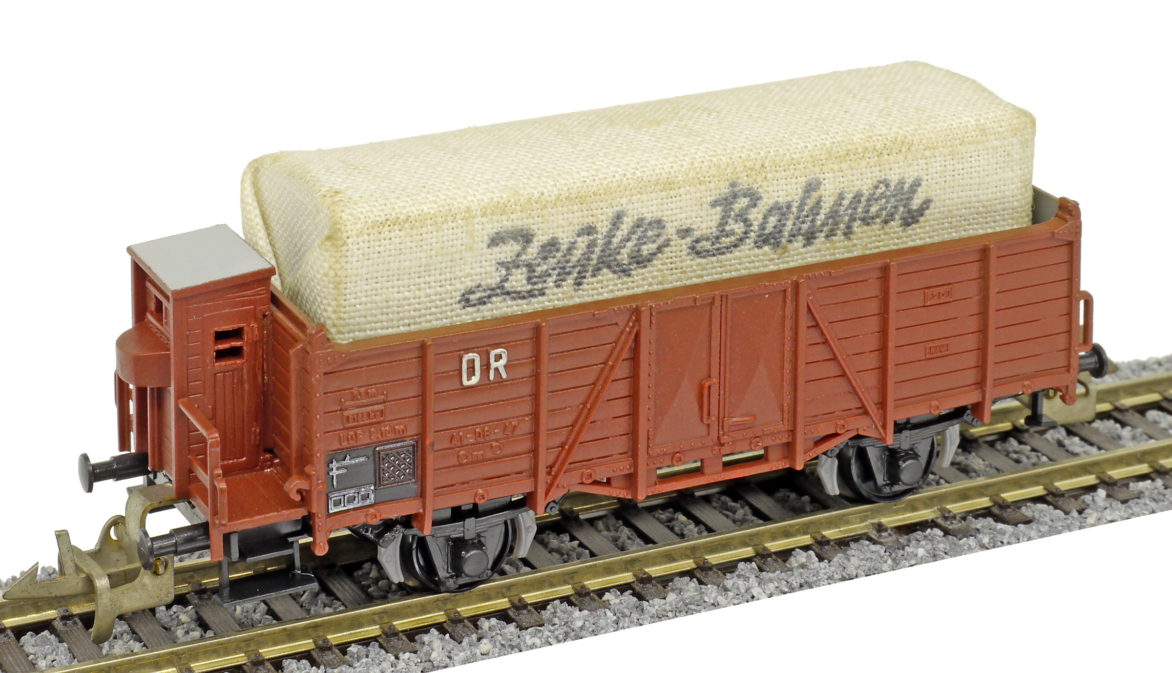 | otevřený nákladní vůz červenohnědý s brzdařskou budkou a s plachtou „Zeuke-Bahnen“ |