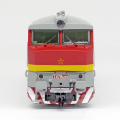 | dieselová lokomotiva červená se žlutým pruhem, šedá střecha a pojezd |