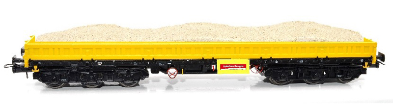 Popis   nízkostěnný nákladní vůz žlutý s černým rámem s nákladem písku „Bahnbau Gruppe“
