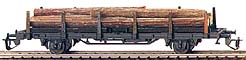 | plošinový nákladní vůz černý s klanicemi ložený kulatinou |