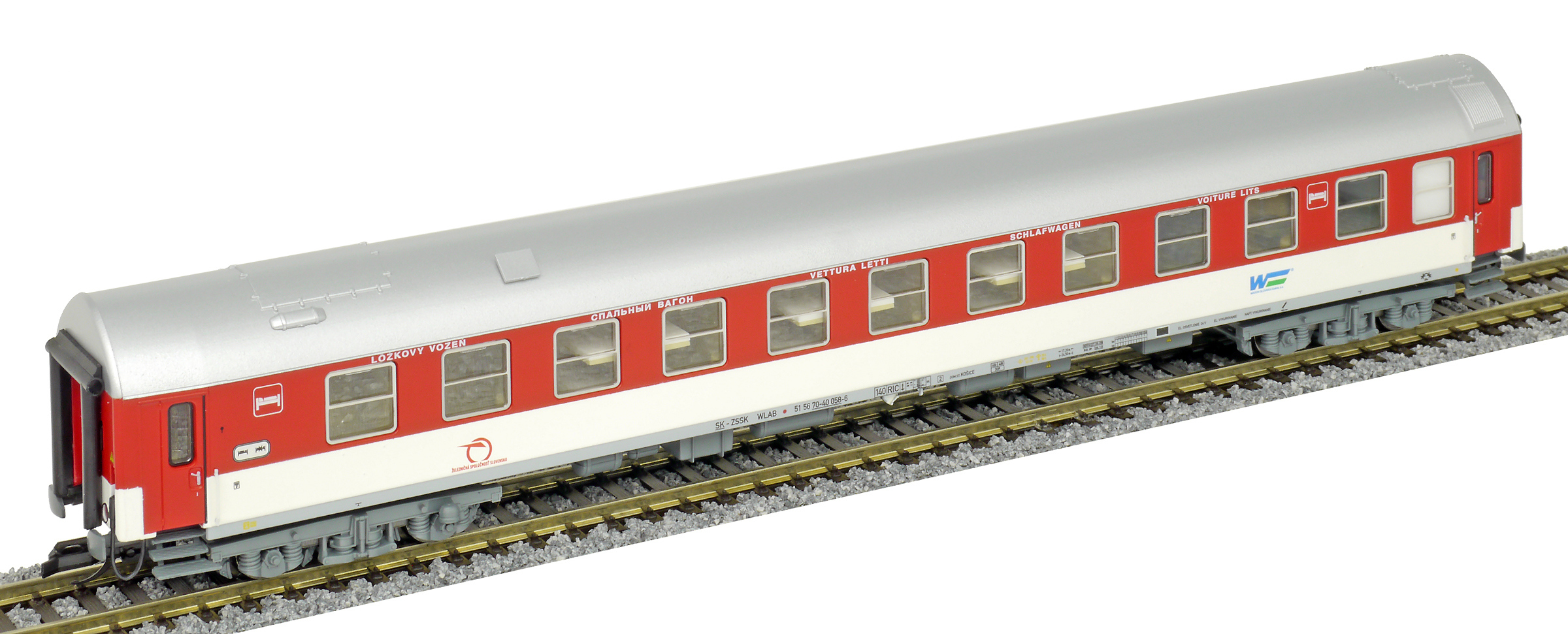 | lůžkový vůz červený-bílý se stříbřitou střechou |