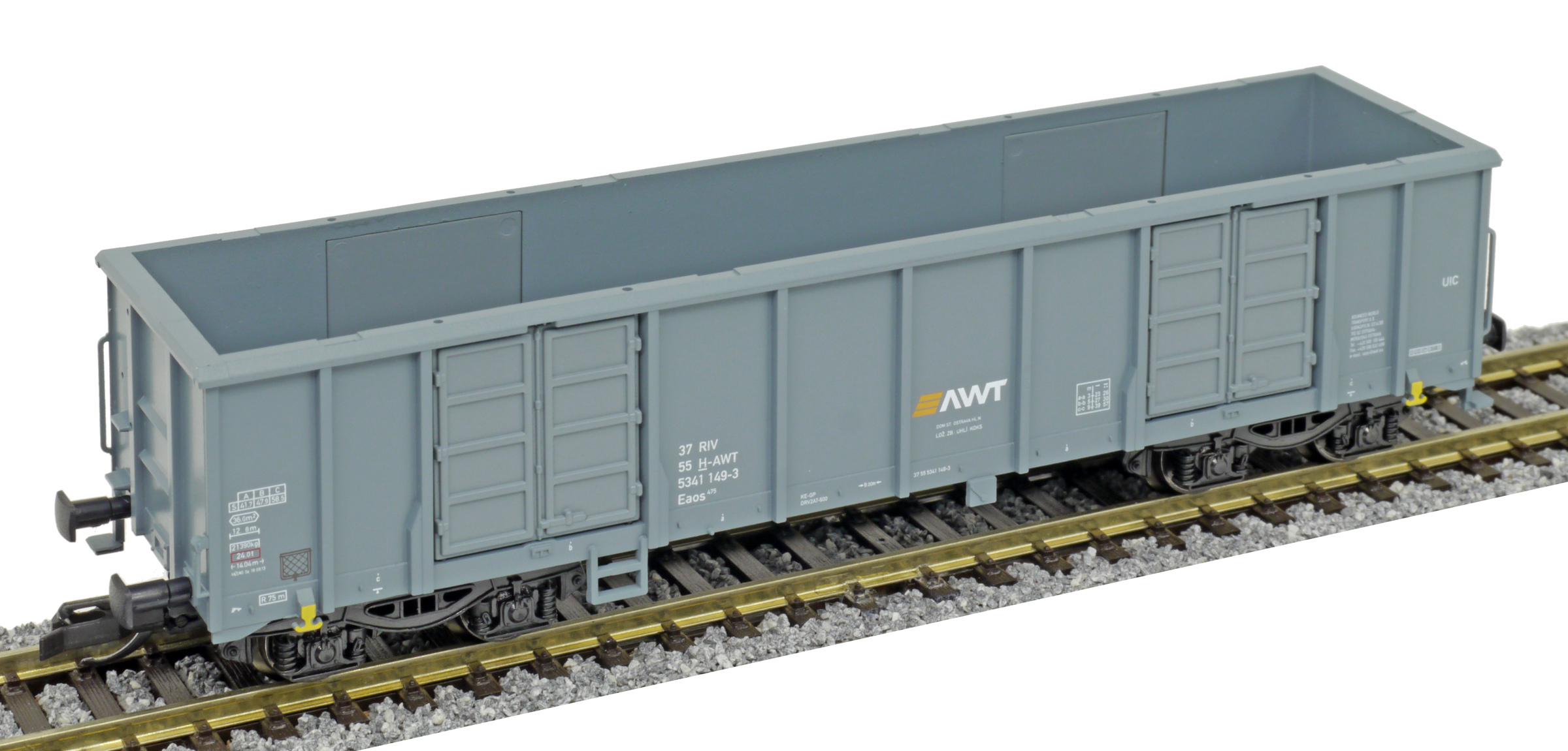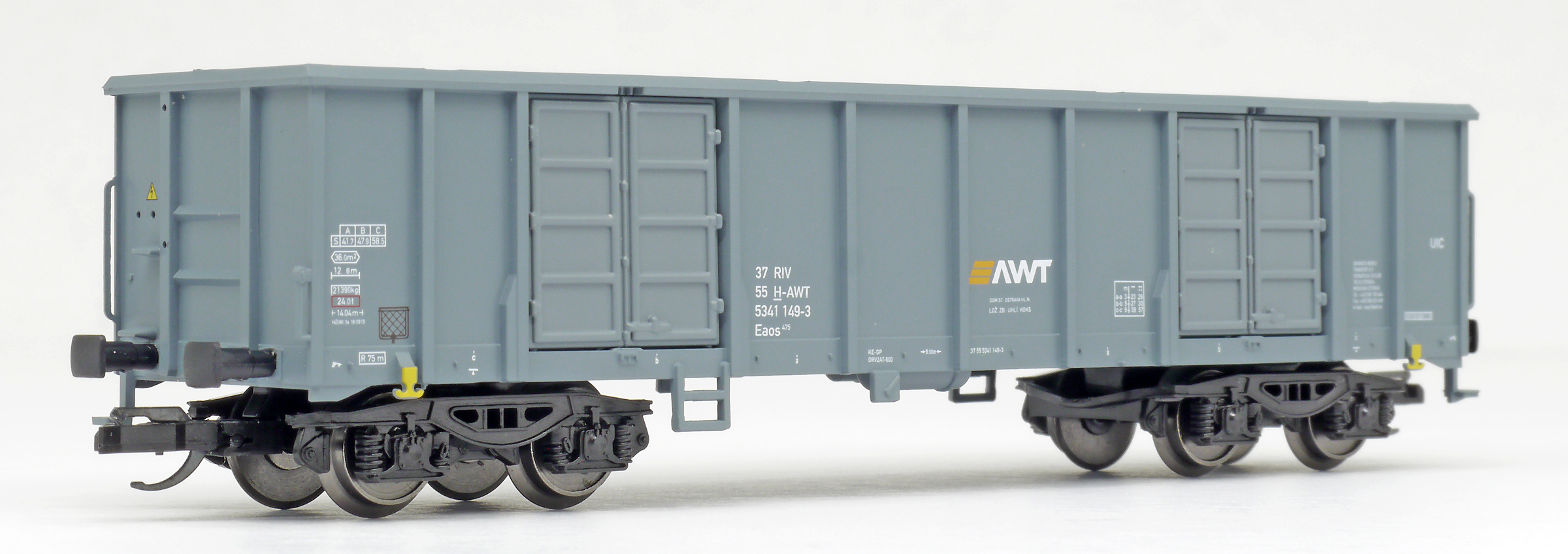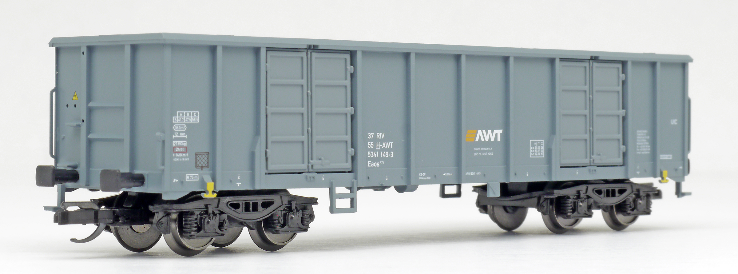 | vysokostěnný nákladní vůz šedý s logem „AWT“ |